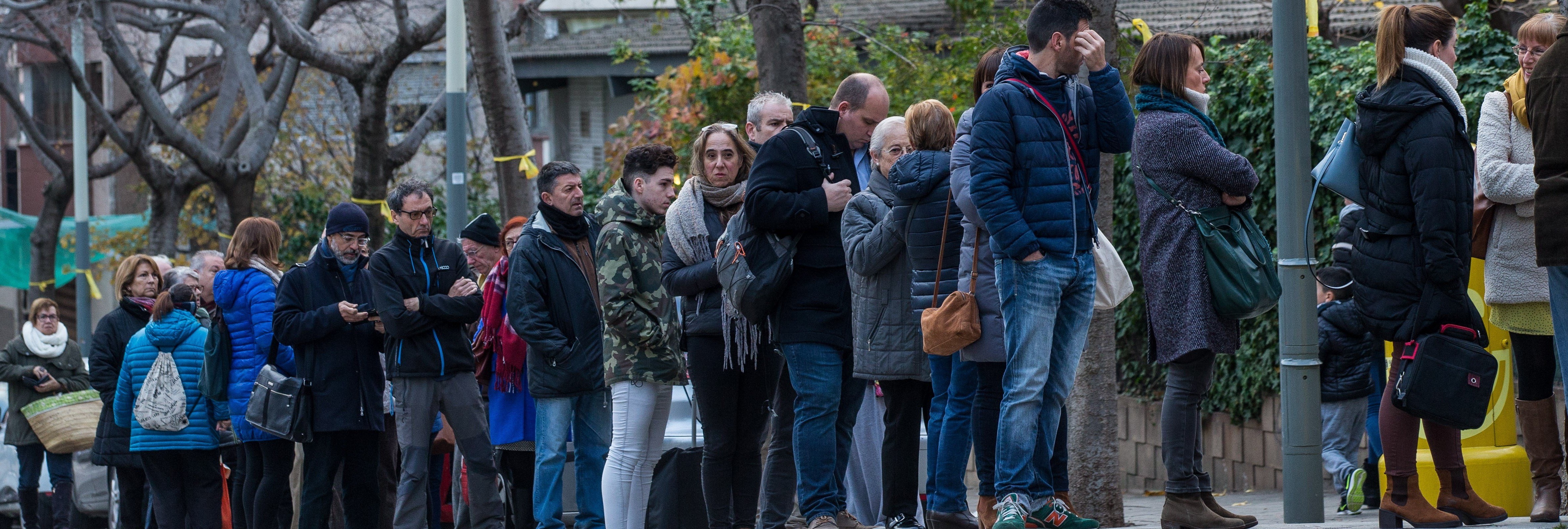 Varias personas esperan en fila la apertura del colegio electoral de la Plaza de la Universidad barcelonés