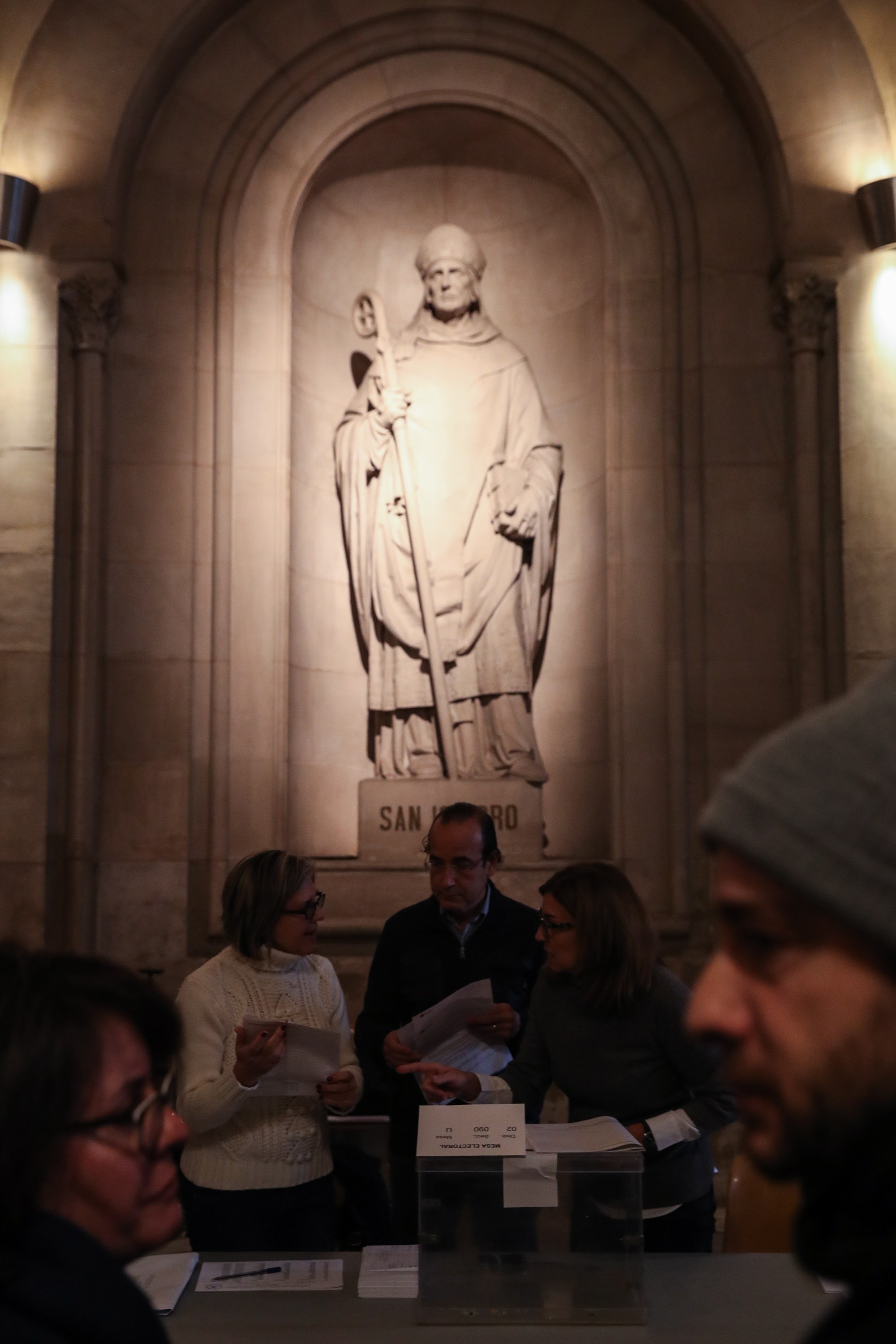 Un grupo de ciudadanos se prepara para votar en el colegio electoral de la Plaza de la Universidad