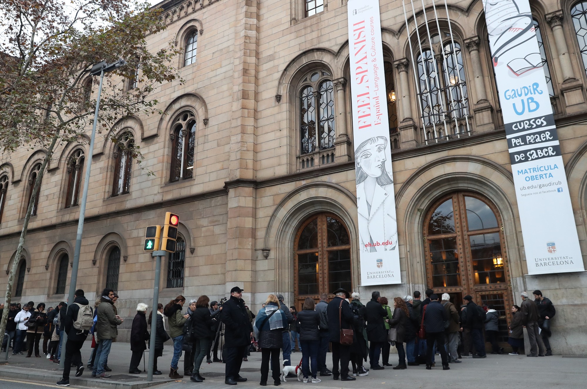 Numerosos ciudadanos guardan cola en el colegio electoral de la Plaza de la Universidad de Barcelona.