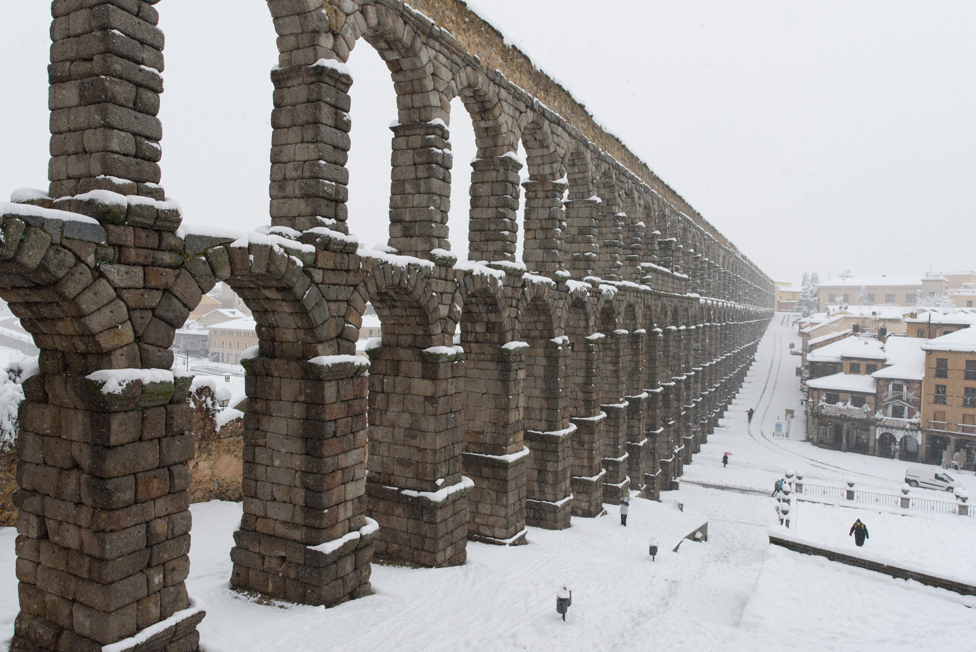 Una vista espectacular del acueducto de Segovia y su plaza totalmente cubierta de nieve.