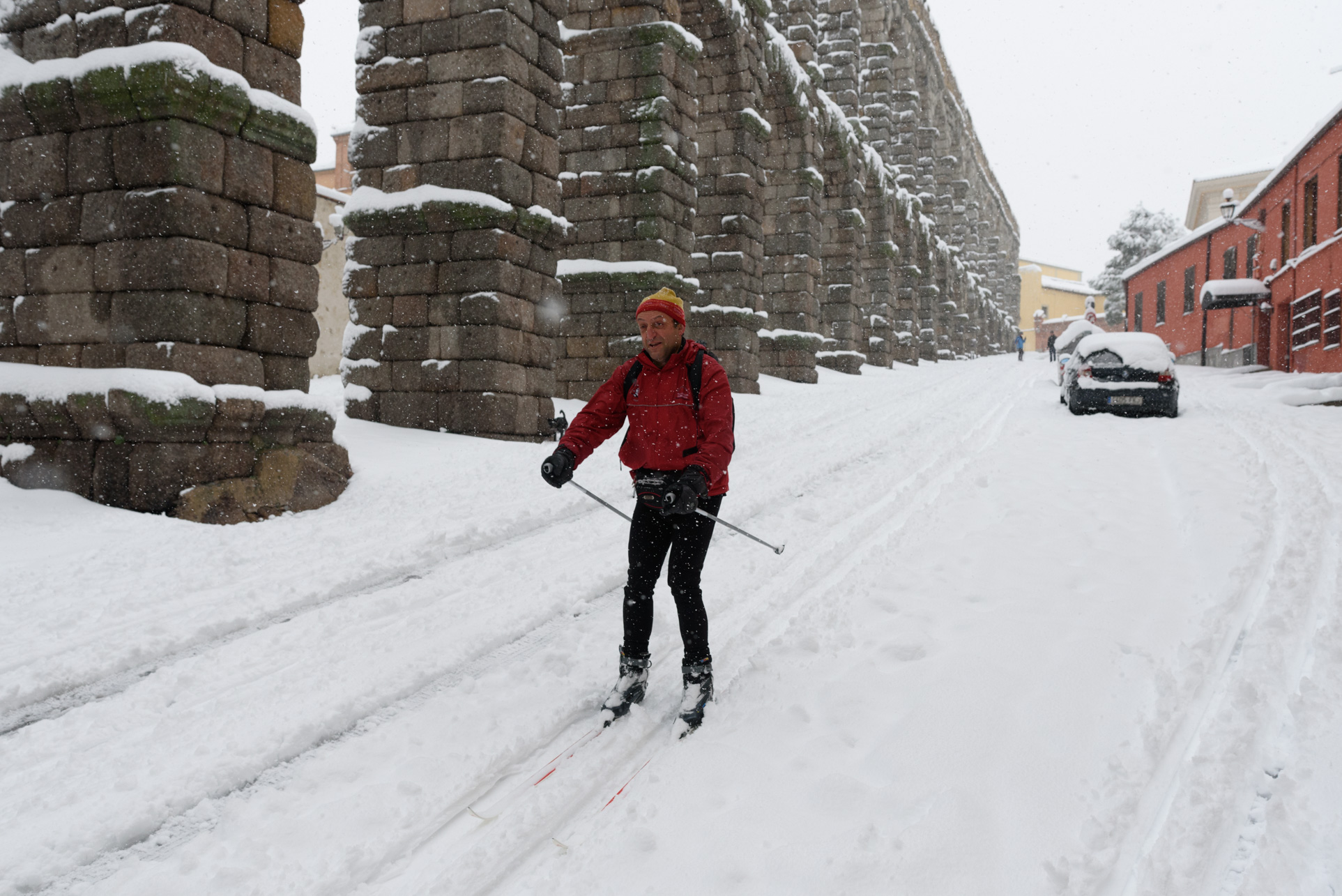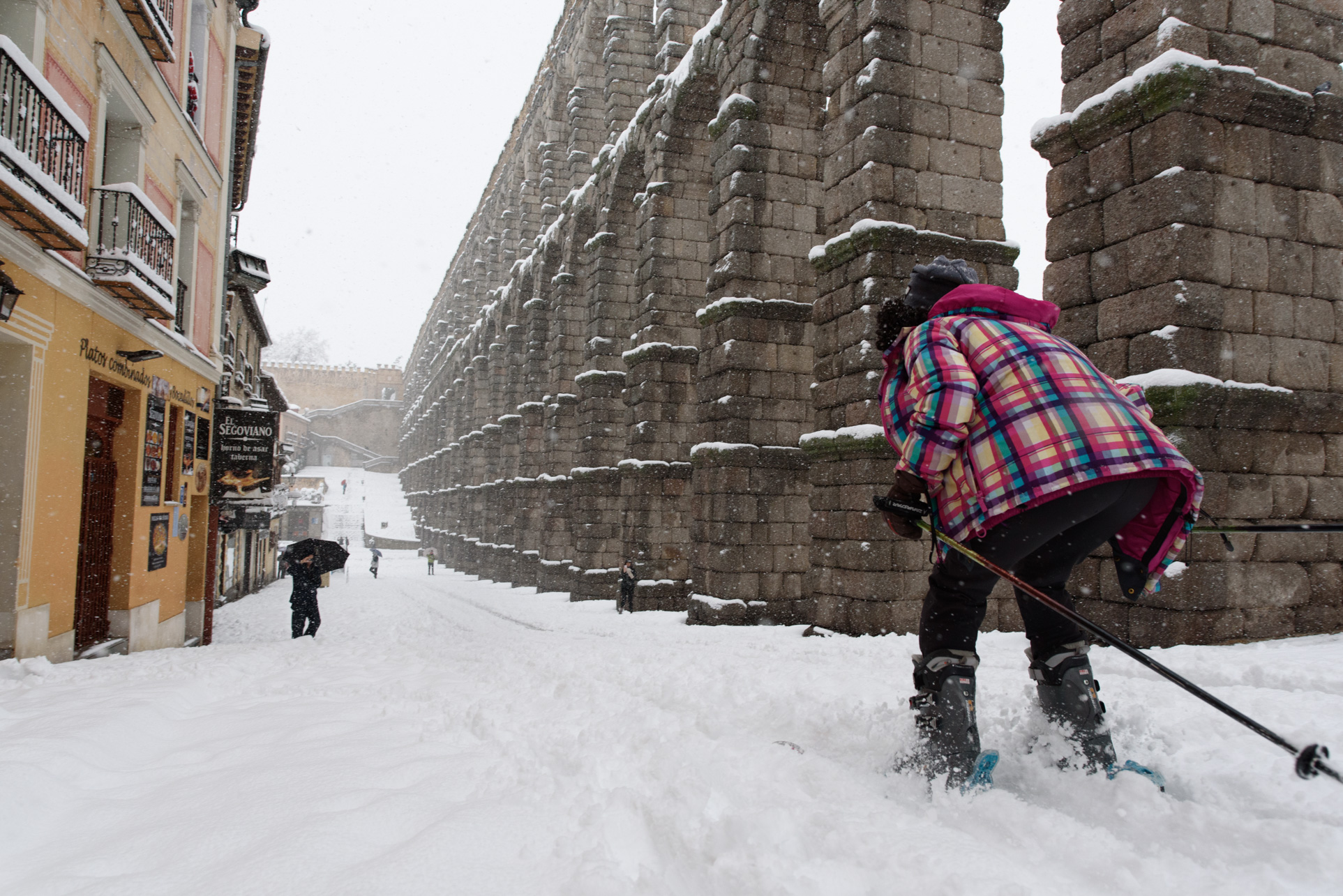 Algunos han aprovechado la copiosa nevada para practicar esquí bajo los arcos del acueducto de Segovia.