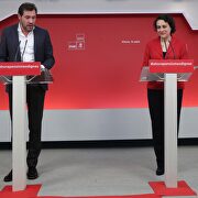 El portvoz Óscar Puente, junto a la secretaria Magdalena Valerio tras la reunión Ejecutiva en Ferraz. El PSOE no descarta pedir el cese de los ministros de Interior y Fomento