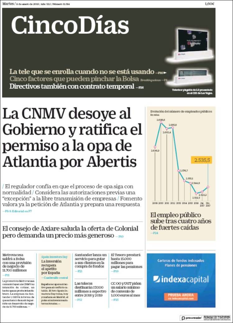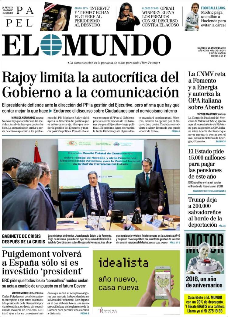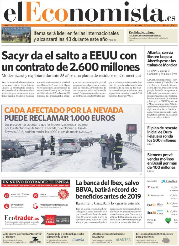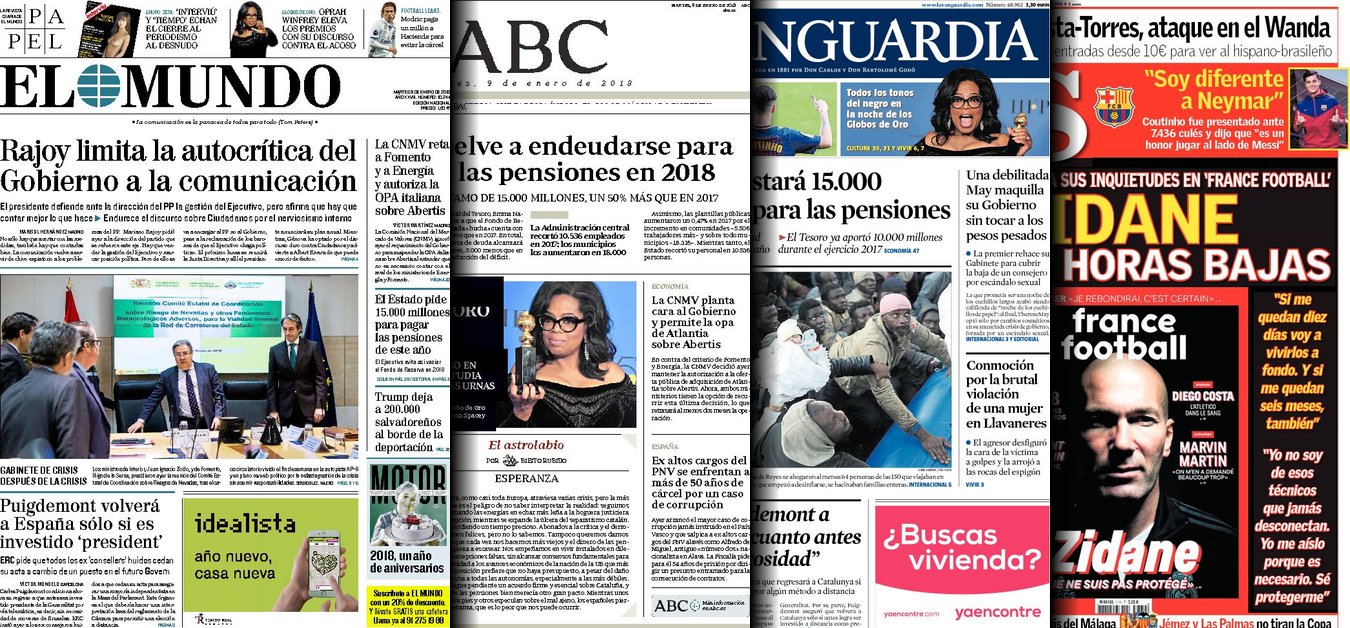 Portadas de los diarios El Mundo, El País, ABC, La Vanguardia, El Periódico, Cinco Días, El Economista, Marca, As y Mundo Deportivo.