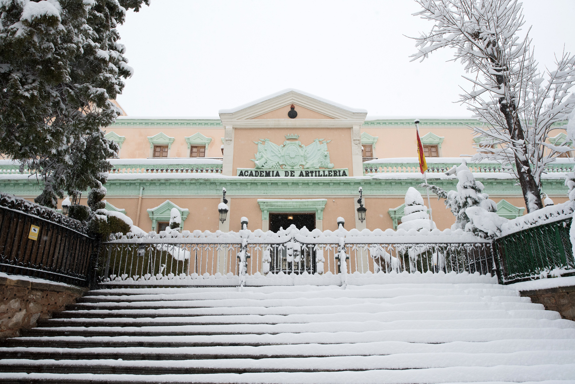 La entrada principal a la academia de artillería de Segovia cubierta de blanco.