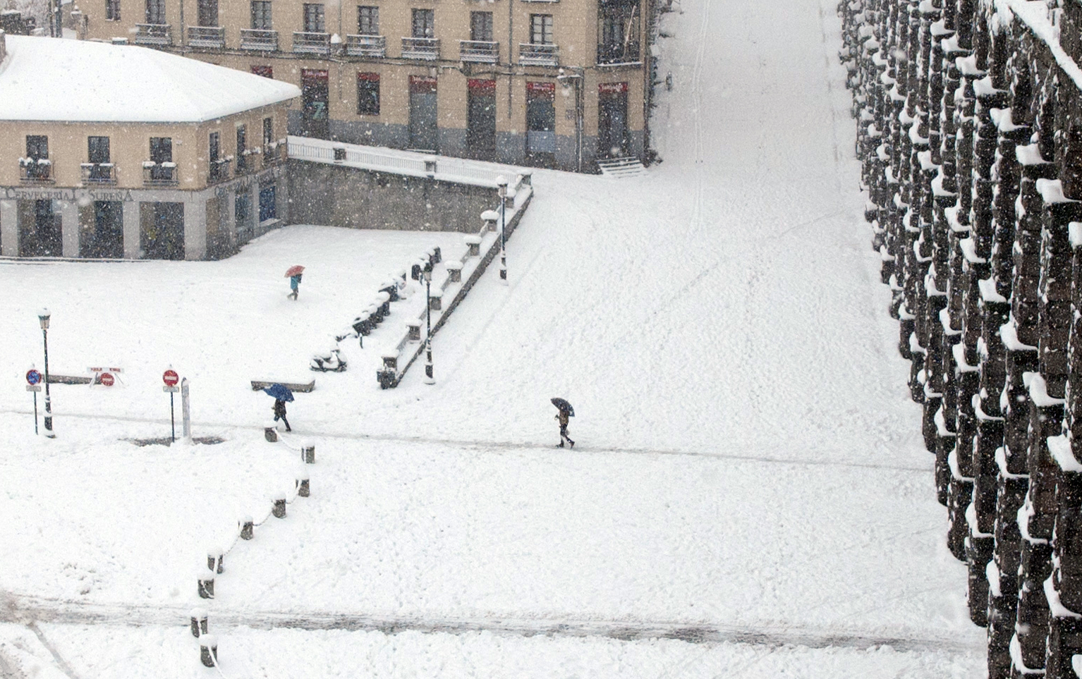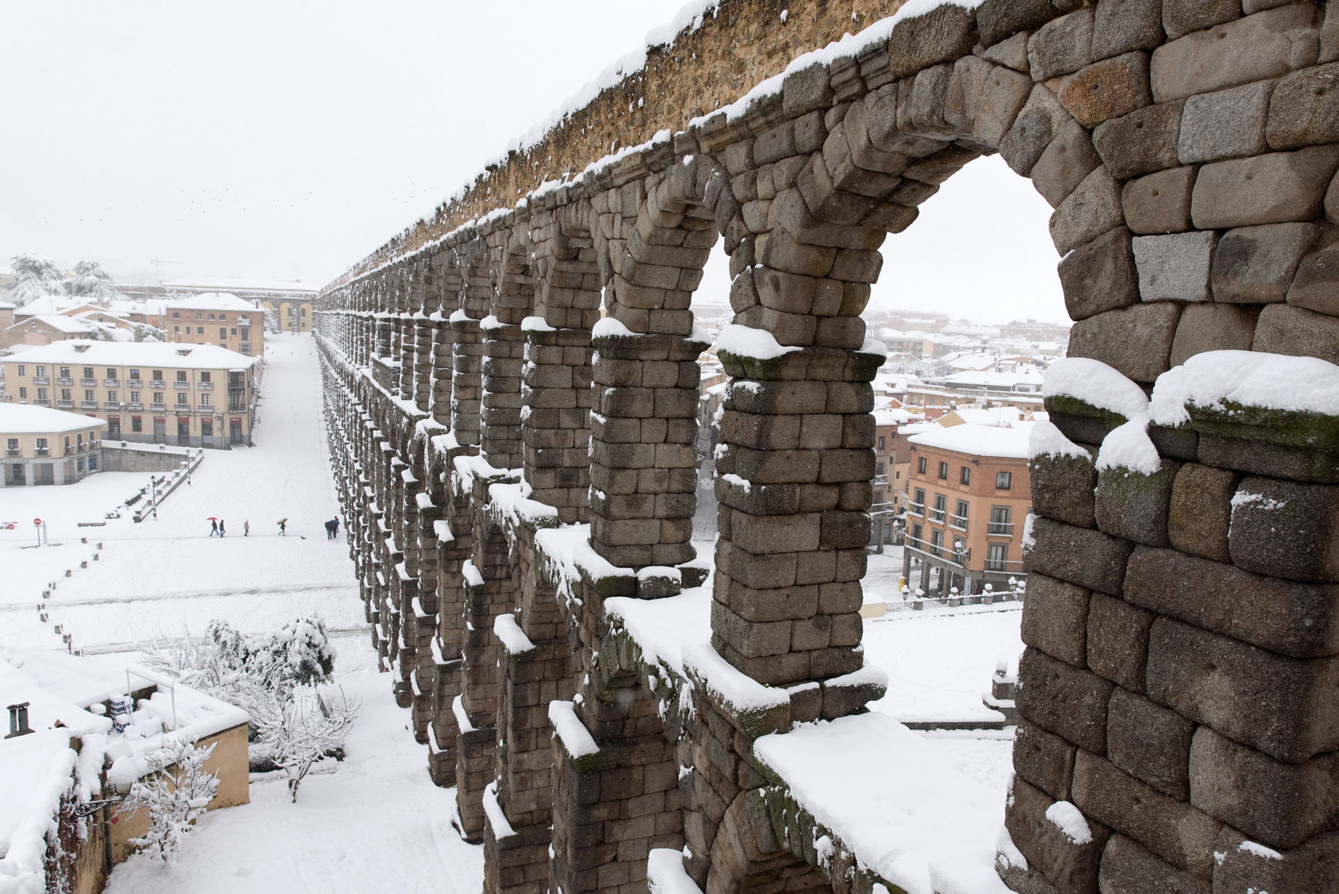 Una vista espectacular del acueducto de Segovia y su plaza totalmente cubierta de nieve.