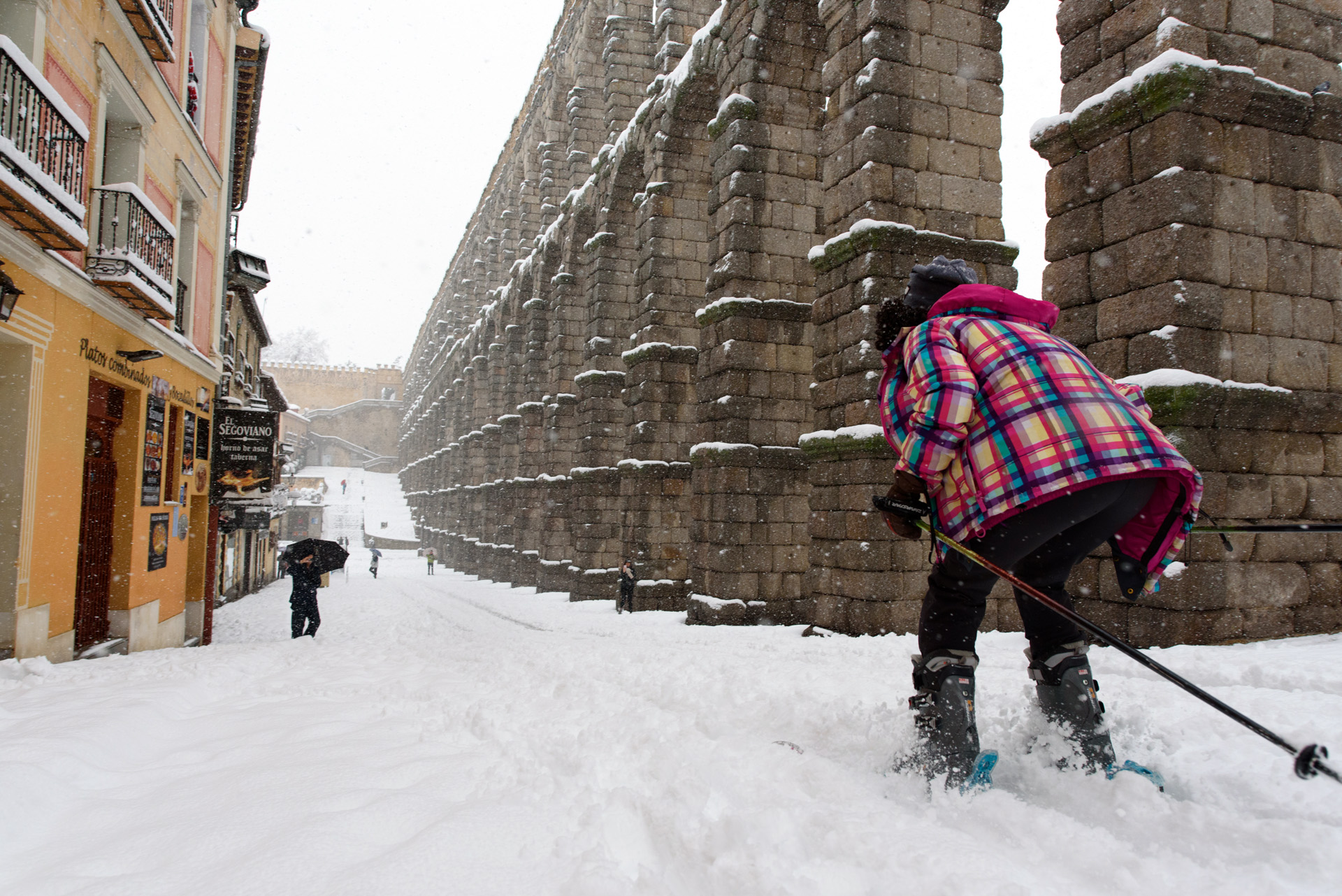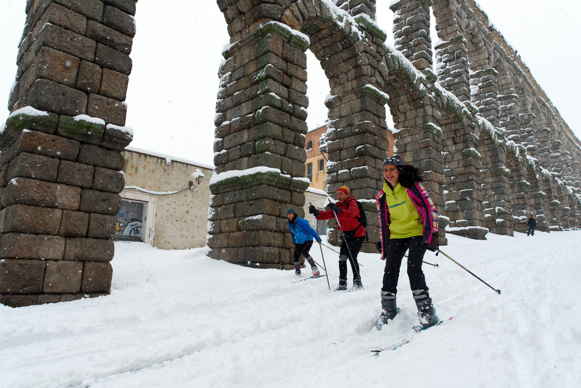 Un imagen que quedará para el recuerdo: varios ciudadanos no dudaron en sacar su equipo de esquí para practicar su deporte favorito bajo el acueducto de Segovia.
