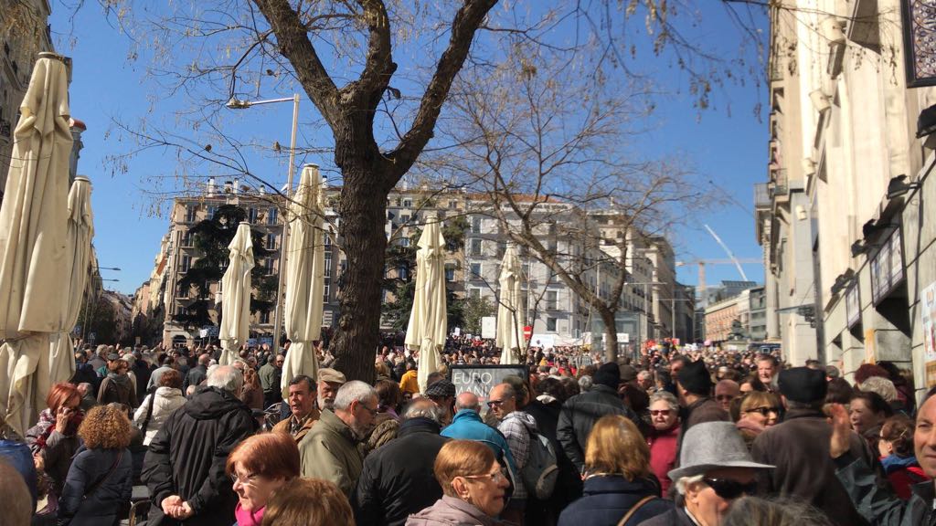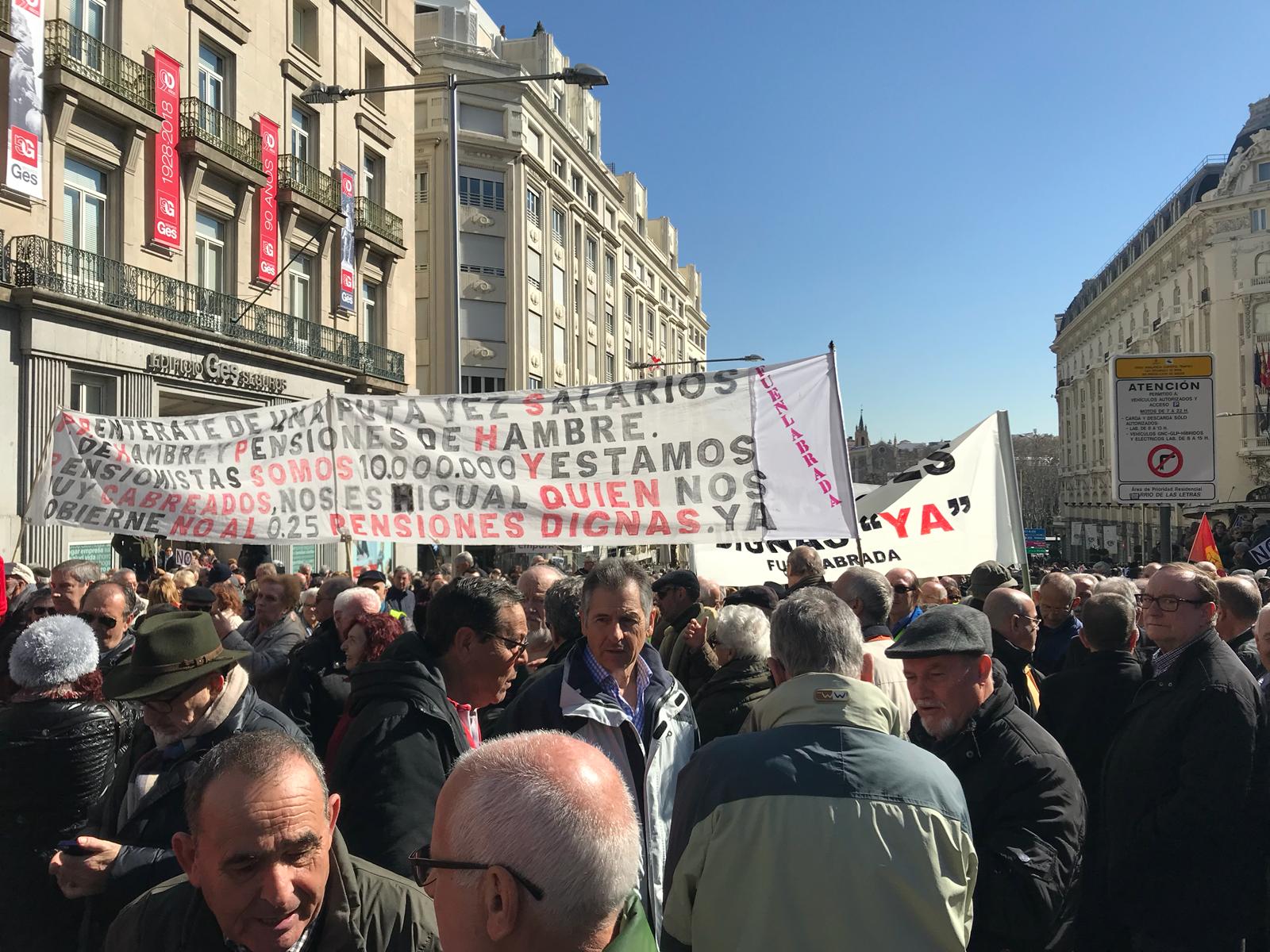 Miles de jubilados, que secundan una concentración en defensa del sistema público de pensiones, han cortado hoy la Carrera de San Jerónimo en Madrid cerrando así el acceso al Congreso de los Diputados.