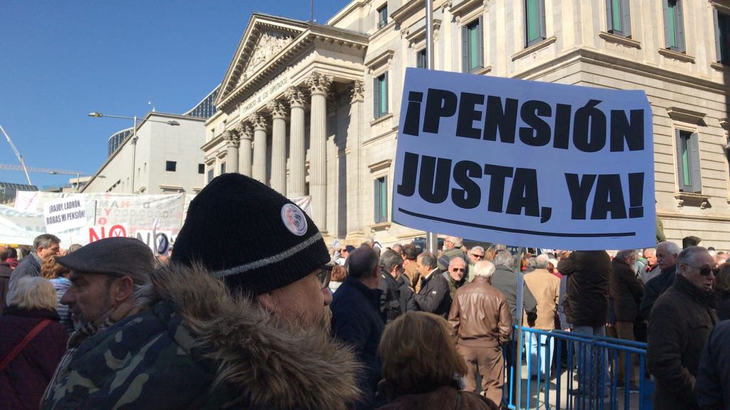 Un jubilado porta una pancarta donde se puede leer \"¡pensión justa, ya!\".