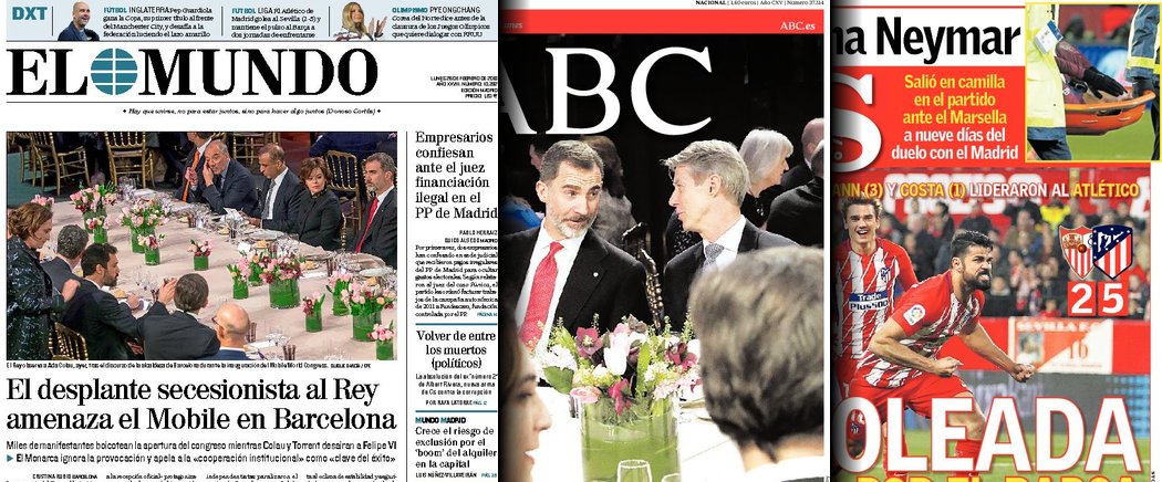 Portadas de los diarios El Mundo, El País, ABC, La Razón, La Vanguardia, El Periódico, Cinco Días, El Economista, Marca, As, Mundo Deportivo y Sport.