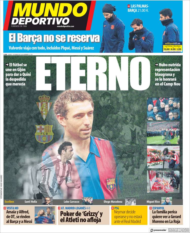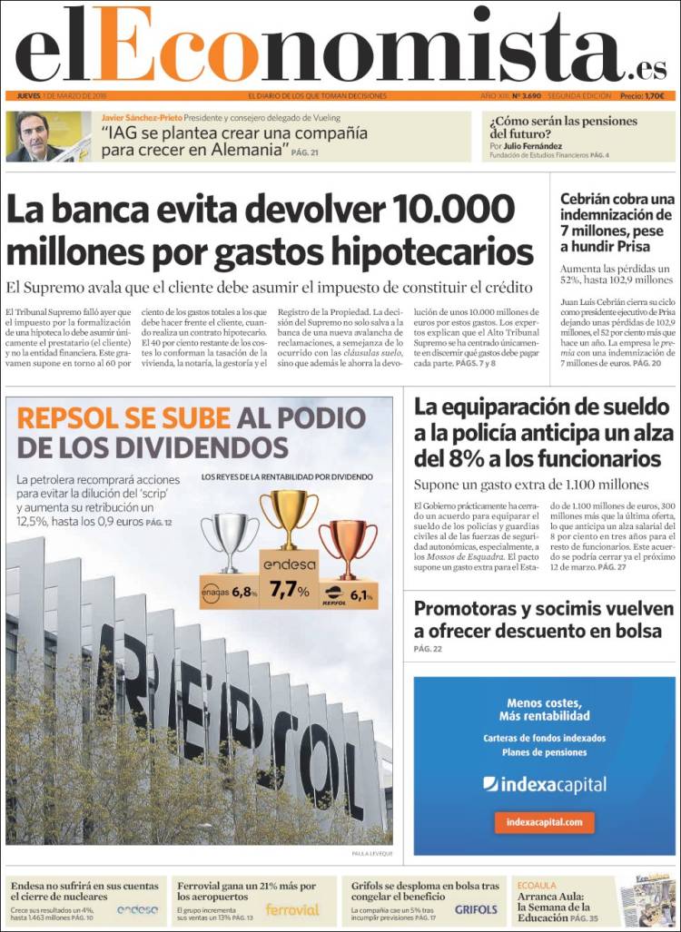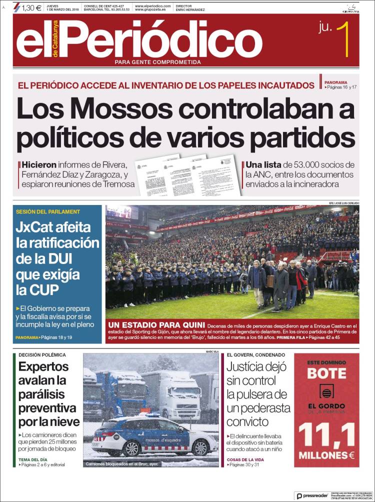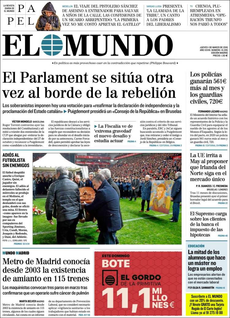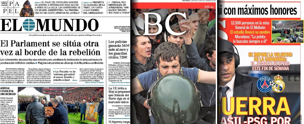 Portadas de los diarios El Mundo, El País, ABC, La Razón, La Vanguardia, El Periódico, Cinco Días, El Economista, Marca, As, Mundo Deportivo y Sport.