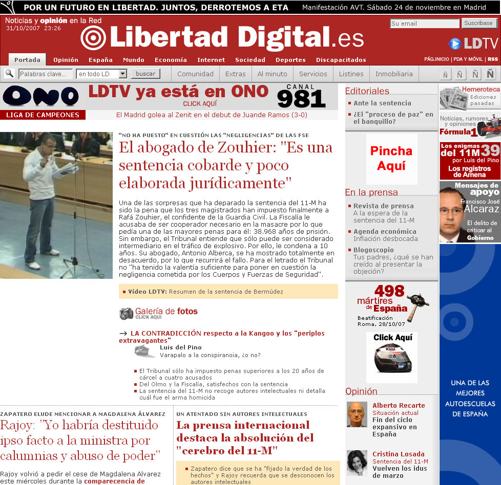En 2007 hicimos un seguimiento exhaustivo y crítico del juicio del 11-M, y de una sentencia en la que el tribunal presidido por Gómez Bermúdez dejó sin cerebros la trama y no aclaró las dudas sobre el arma del crimen. El cuarto diseño de Libertad Digital se estrenó ese mismo año.