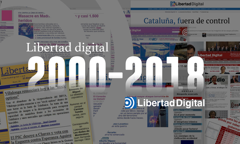 El 8 de marzo del año 2000, cuando la Red estaba todavía en pañales, nacía Libertad Digital, uno de los primeros periódicos nativos de internet, sin hermano mayor de papel. En estos dieciocho años de información y análisis hemos desarrollado una personalidad propia muy marcada, que nos convierte en un medio diferente, como se refleja en este repaso de nuestra trayectoria.