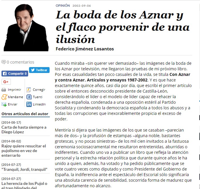 La boda de Ana Aznar y Alejandro Agag, el 5 de septiembre de 2002, supuso el principio del fin de aznarismo. En Libertad Digital no esperamos 15 años para advertirlo, lo dijimos al día siguiente.