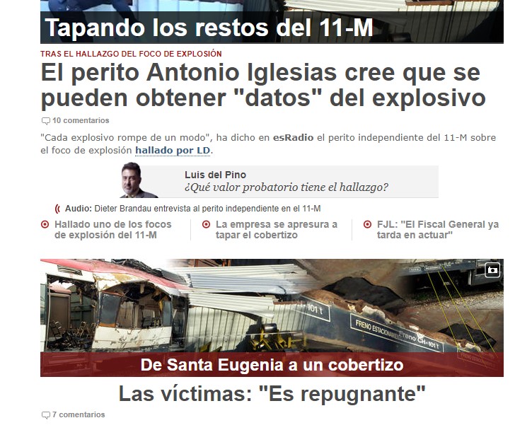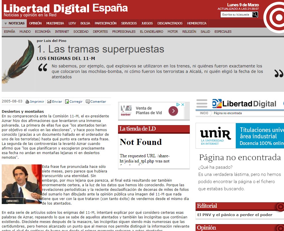 El 3 de marzo, a pocos días del primer aniversario del 11-M, Luis del Pino publicaba el primer capítulo de Los Enigmas del 11-M. Esta serie de artículos ya forma parte de la historia del periodismo de investigación en España y de la identidad de Libertad Digital. I Libertad Digital.
