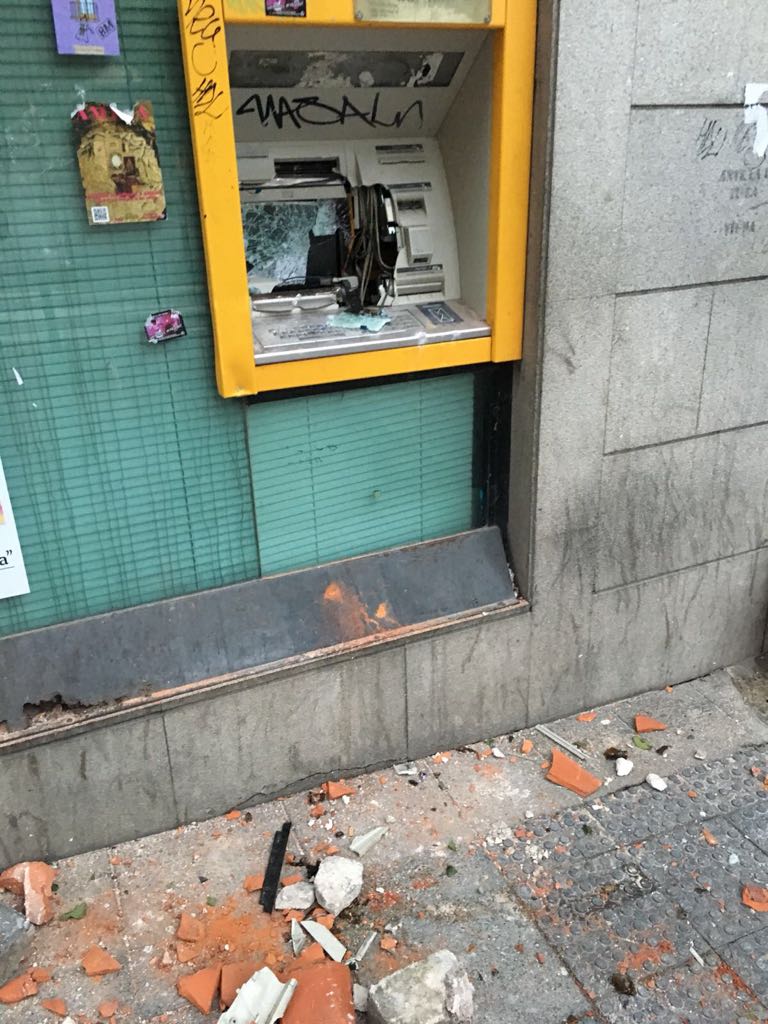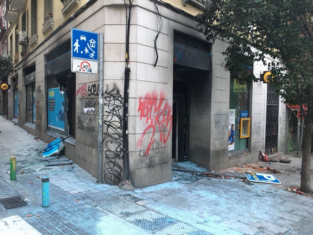 Así quedó una oficina de CaixaBank en Lavapiés. Los violentos no sólo rompieron los cristales sino que incendiaron el interior y destrozaron el cajero automático.