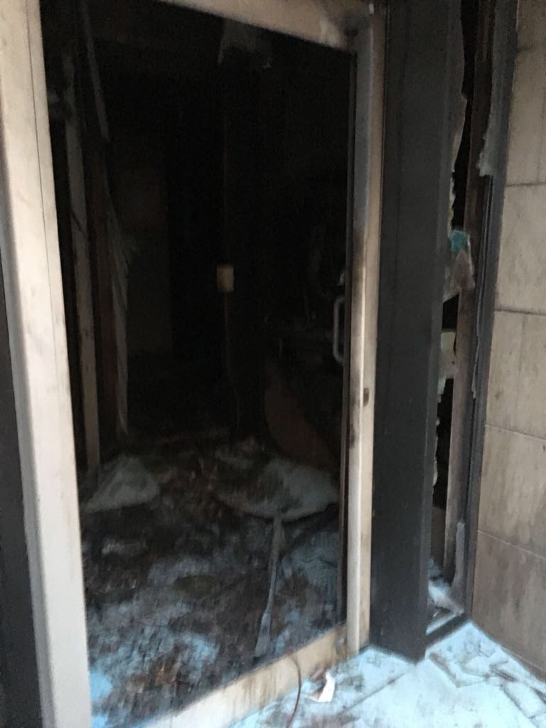 Interior calcinado de una oficina de CaixaBank tras el paso de los violentos la pasada noche en Lavapiés