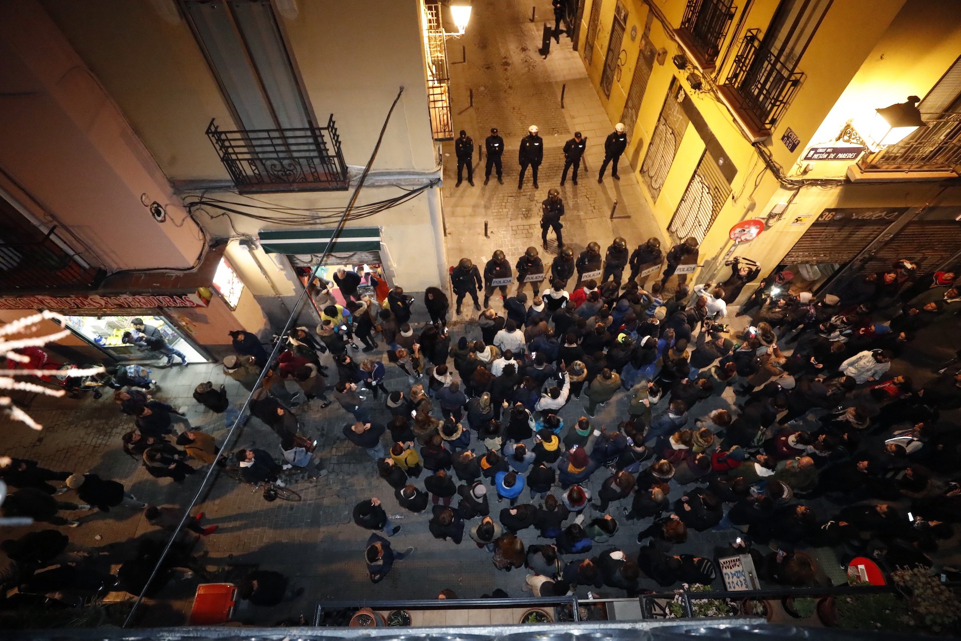 Policías antidisturbios intentan calmar la tensión en la calle Mesón de Paredes con la calle del Oso, en el barrio de Lavapiés de Madrid.