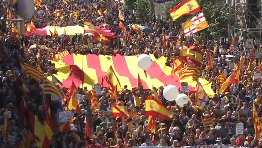 Miles de ciudadanos se manifiestan este domingo en Barcelona convocados por Sociedad Civil Catalana bajo el lema "Ahora más que nunca, seny", desde la plaza Colón, la avenida Marqués de Argentera hasta la estación de Francia, donde están programados varios parlamentos.
