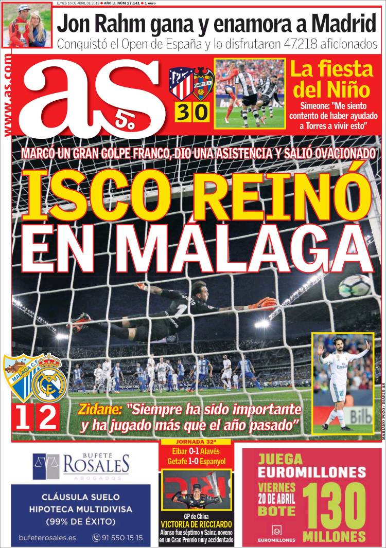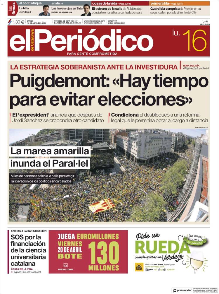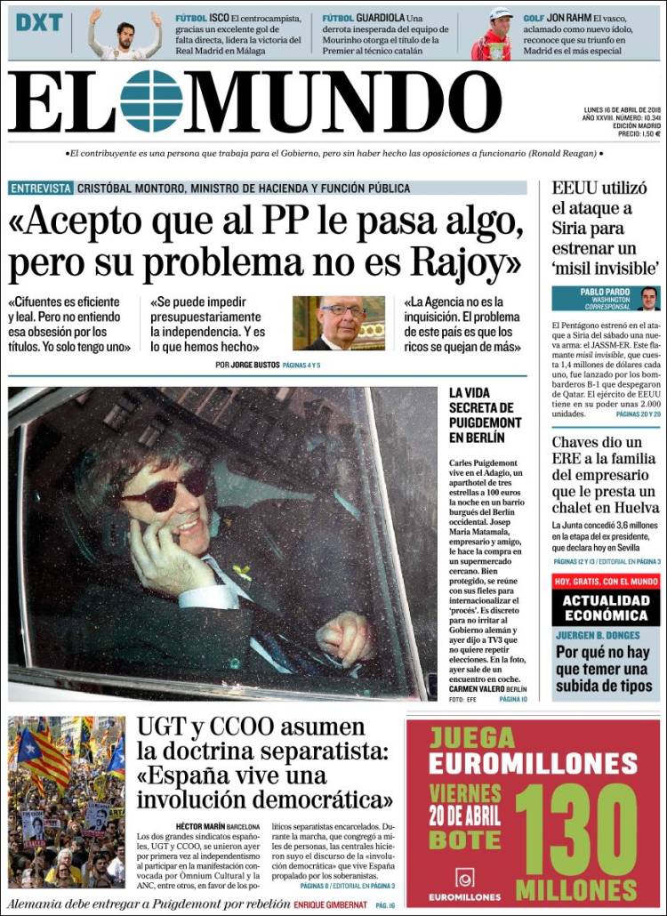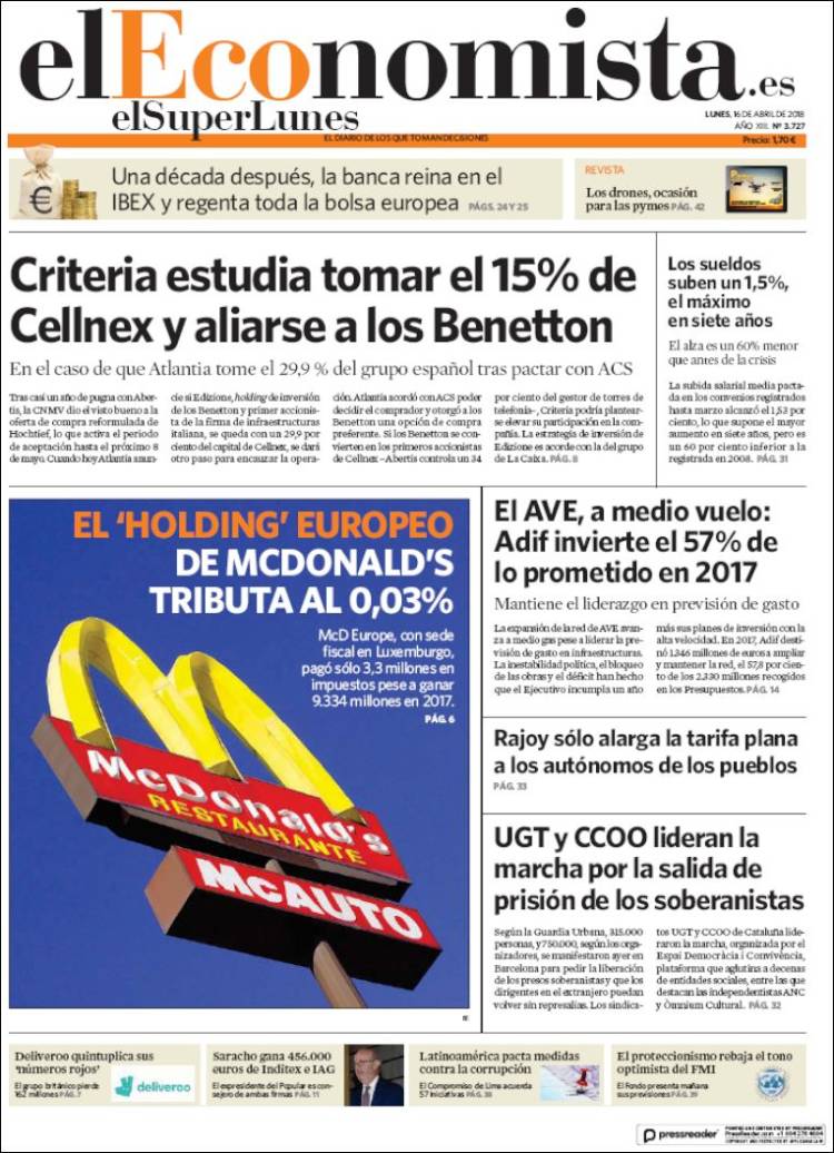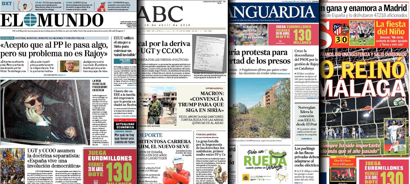 Portadas de los diarios El Mundo, El País, ABC, La Razón, La Vanguardia, El Periódico, Cinco Días, El Economista, Marca, As, Mundo Deportivo y Sport.