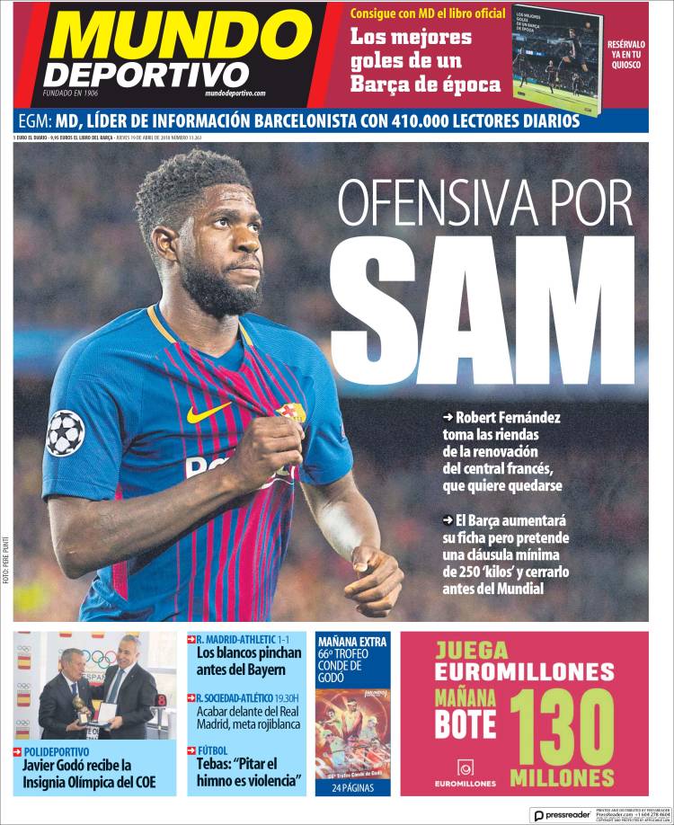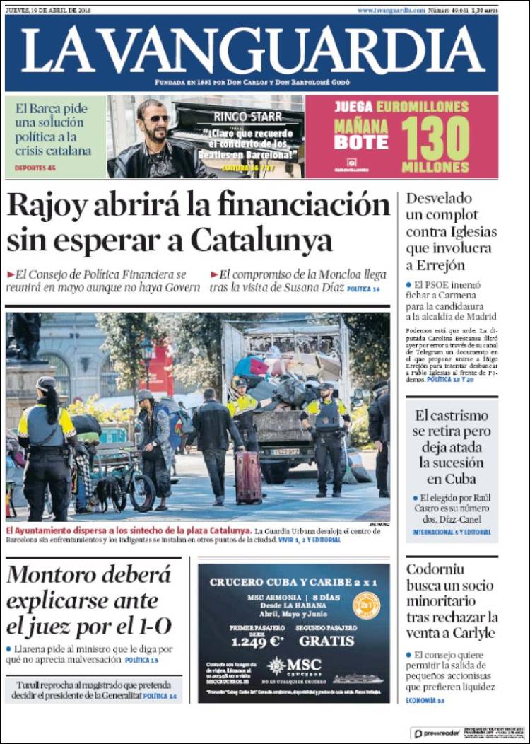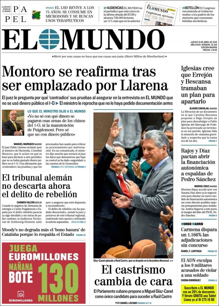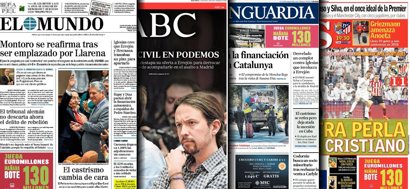 Portadas de los diarios El Mundo, El País, ABC, La Razón, La Vanguardia, El Periódico, Cinco Días, El Economista, Marca, As, Mundo Deportivo y Sport.