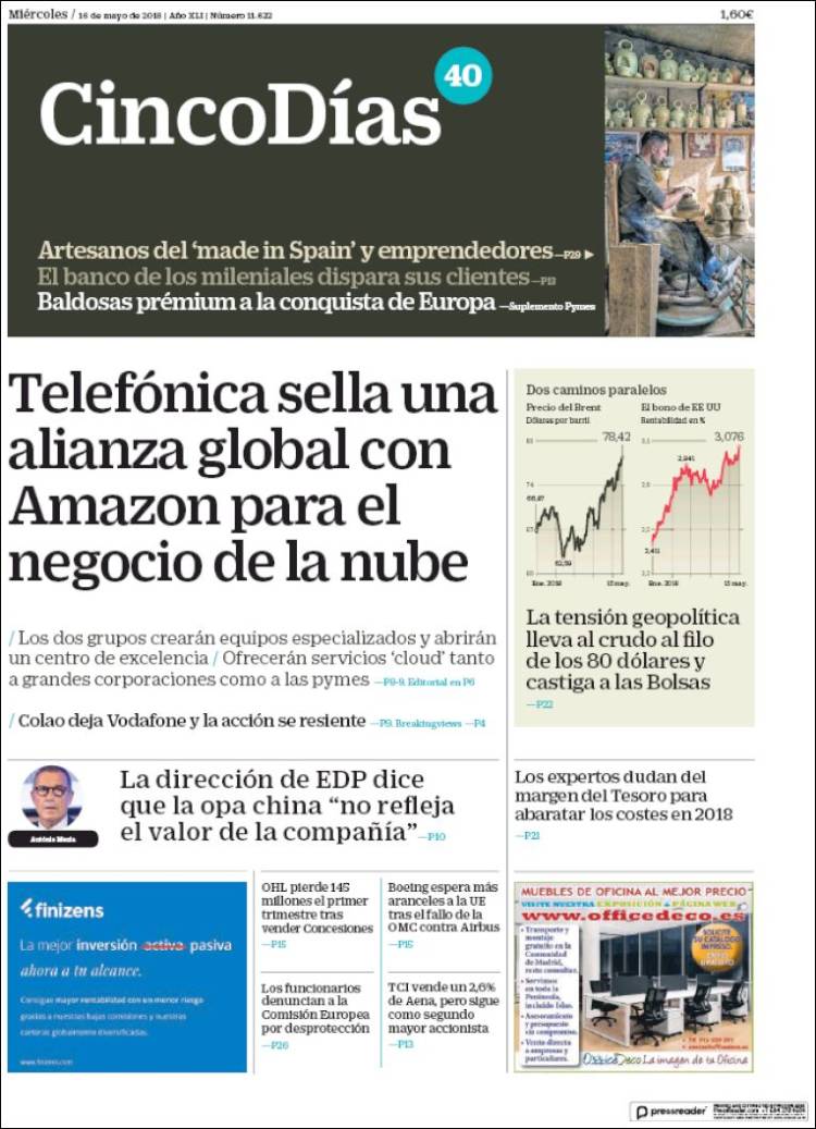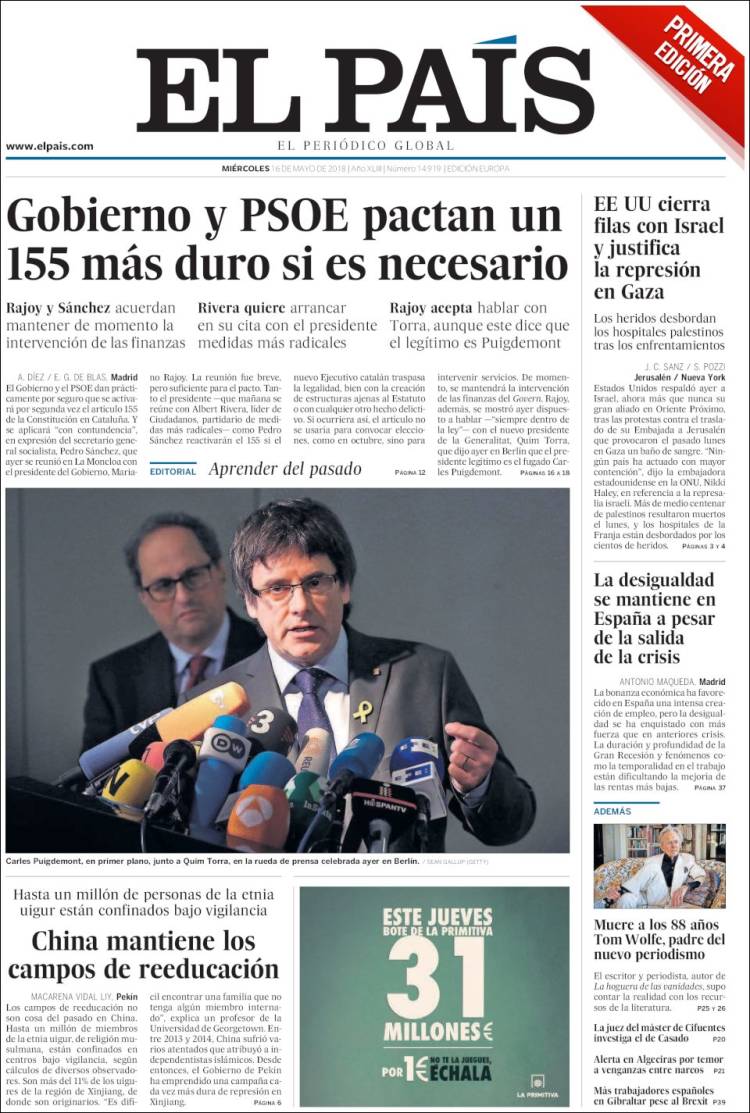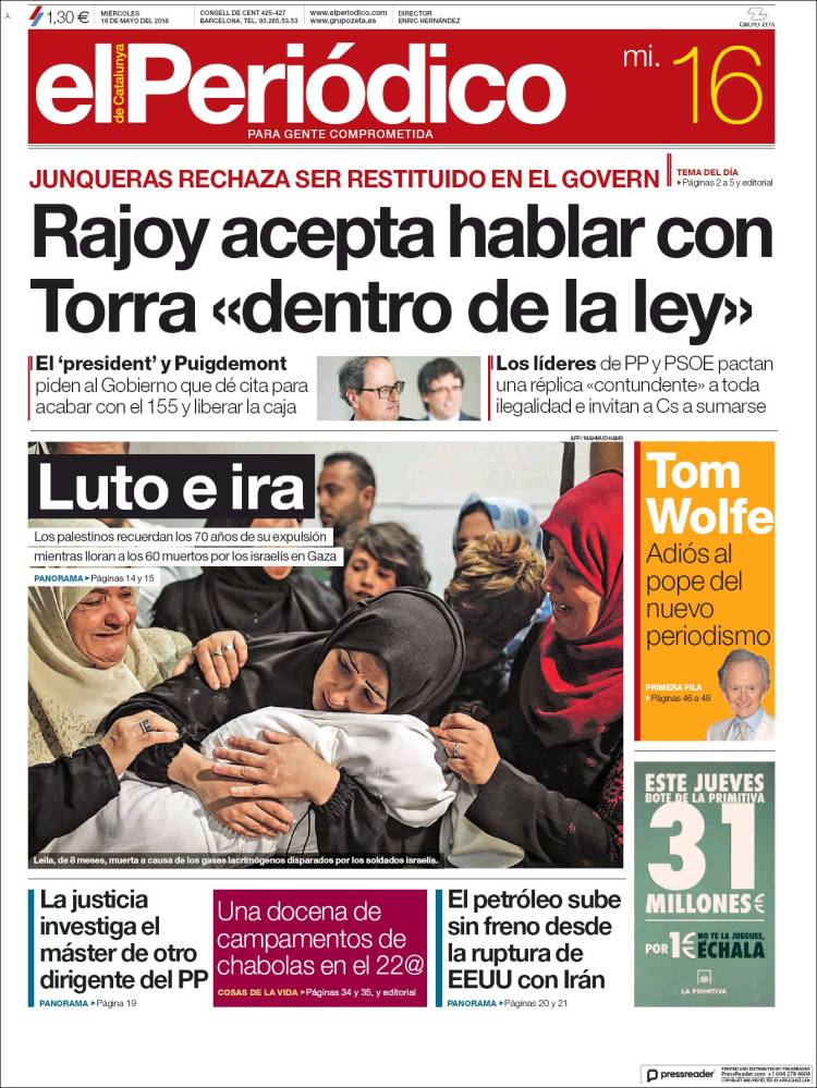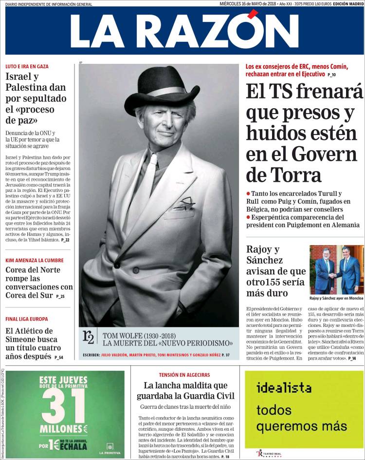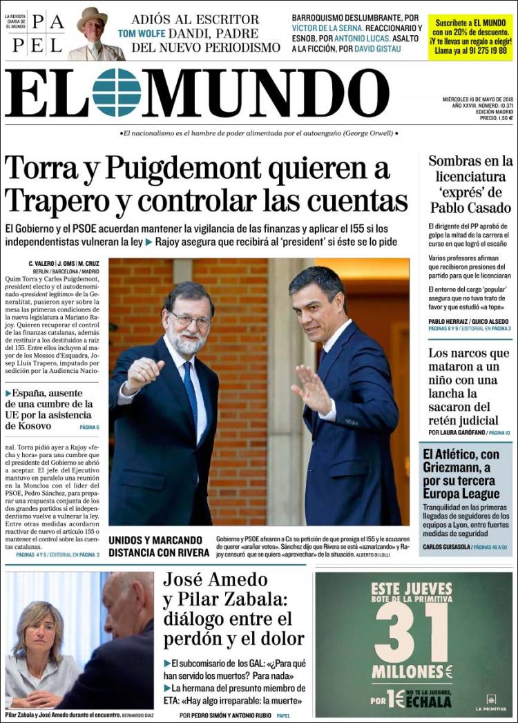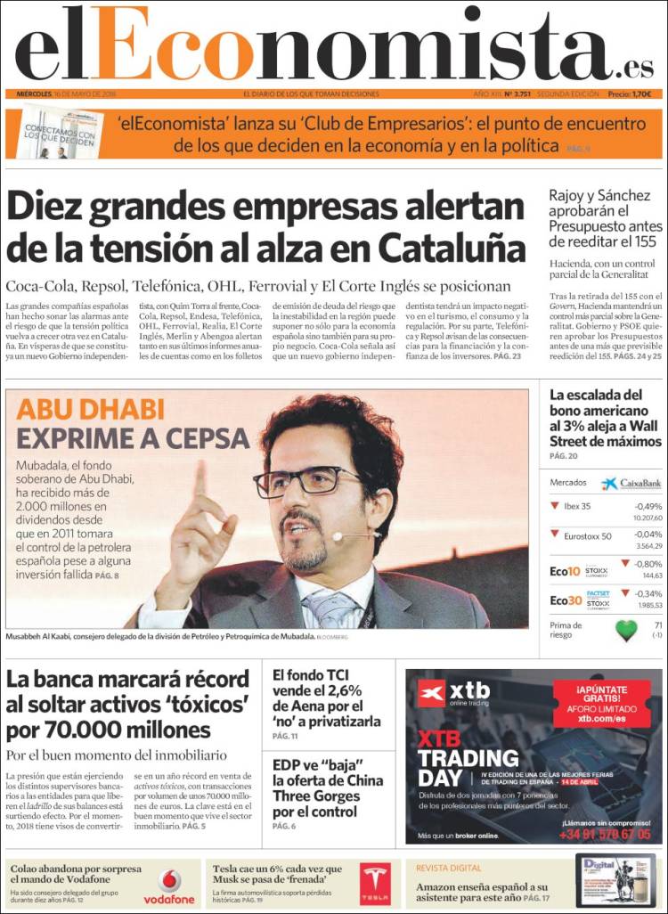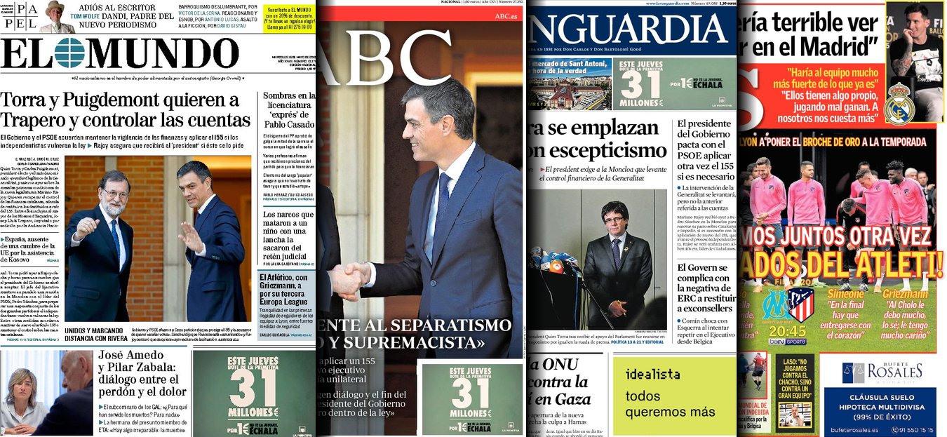Portadas de los diarios El Mundo, El País, ABC, La Razón, La Vanguardia, El Periódico, Cinco Días, El Economista, Marca, As, Mundo Deportivo y Sport.