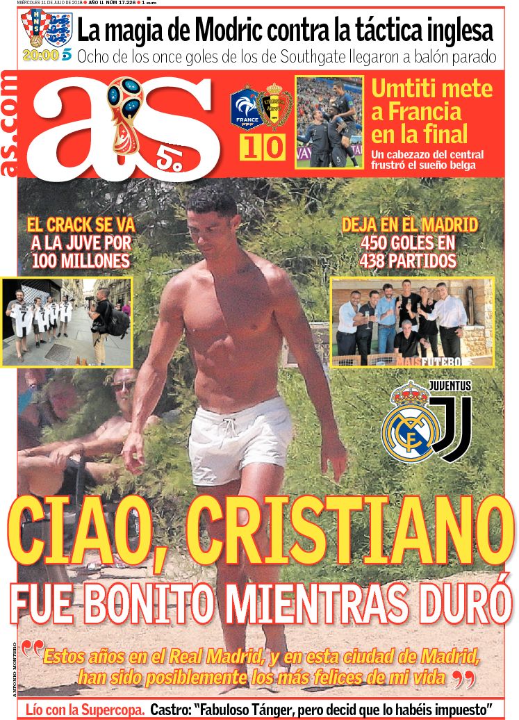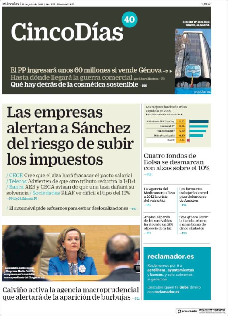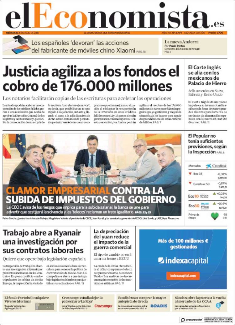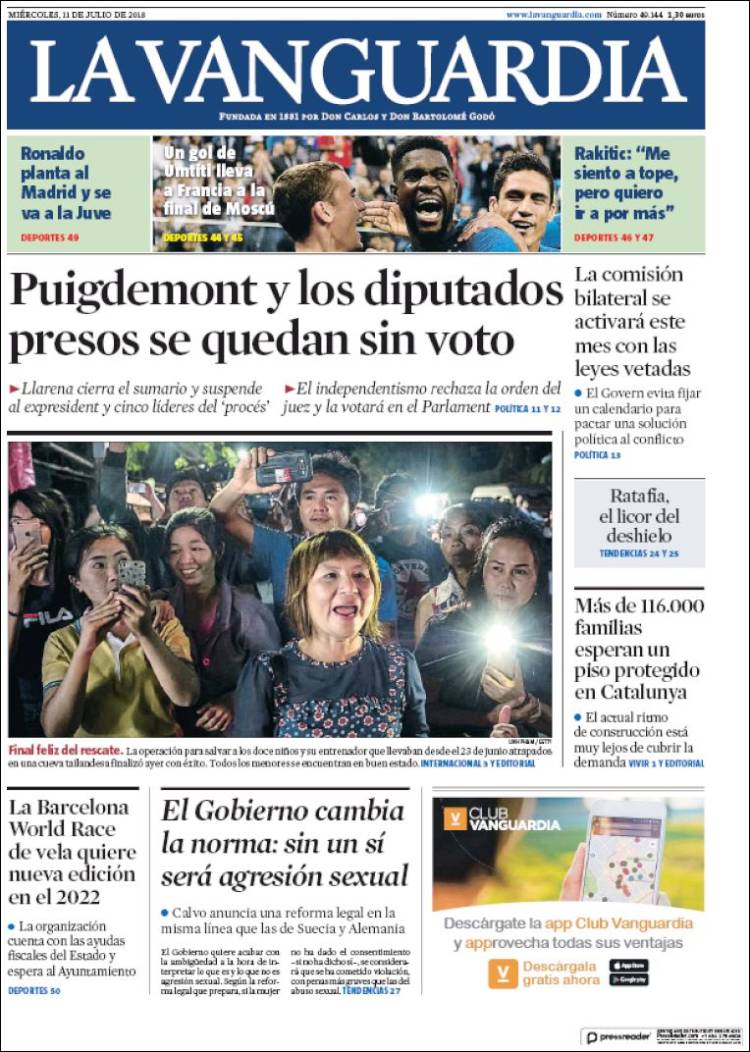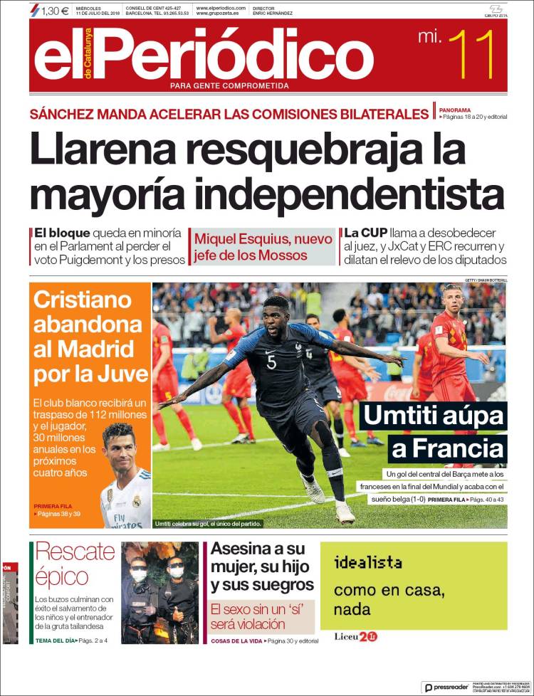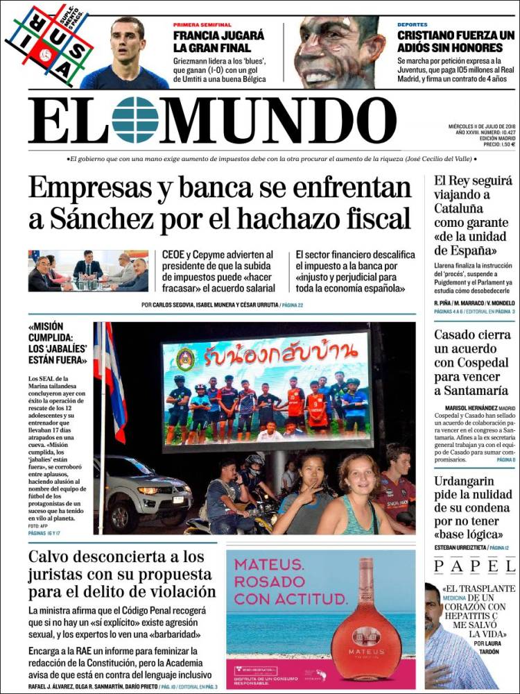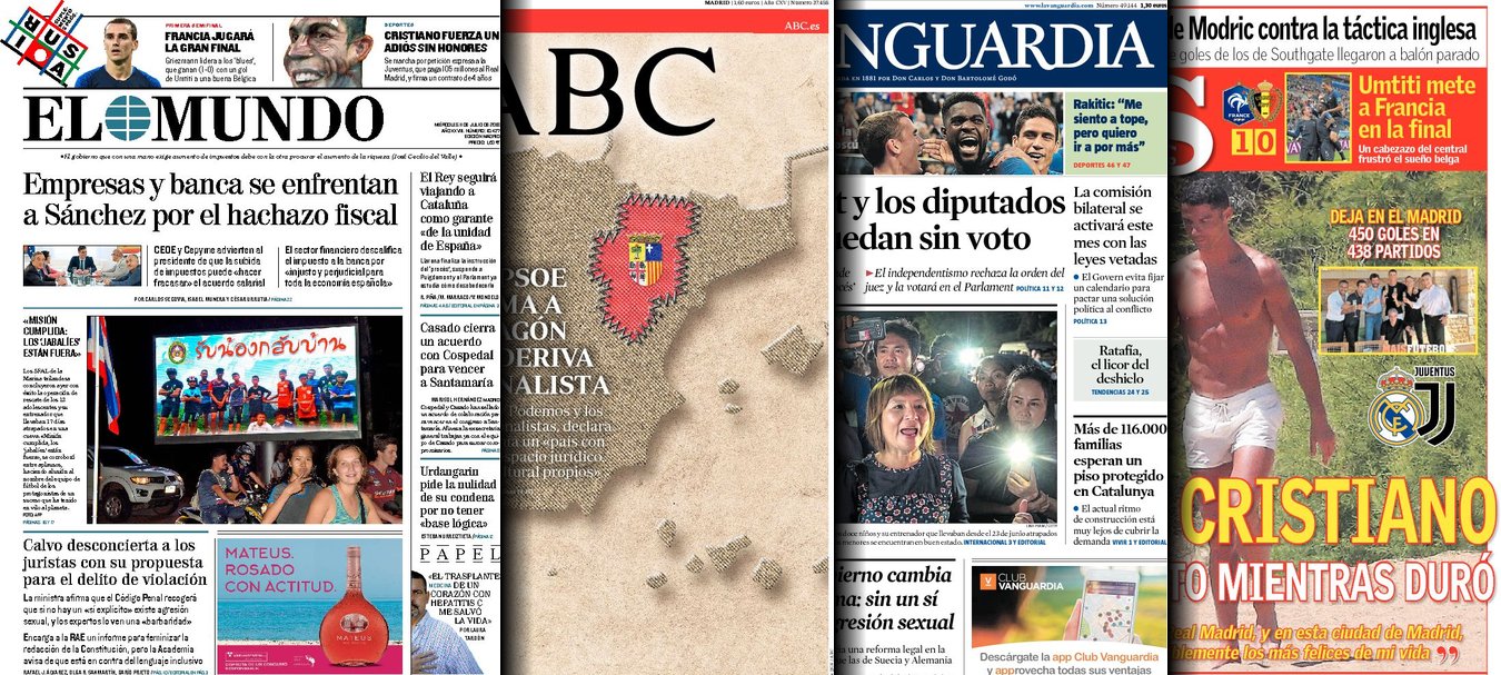 Portadas de los diarios El Mundo, El País, ABC, La Razón, La Vanguardia, El Periódico, Cinco Días, El Economista, Marca, As, Mundo Deportivo y Sport.