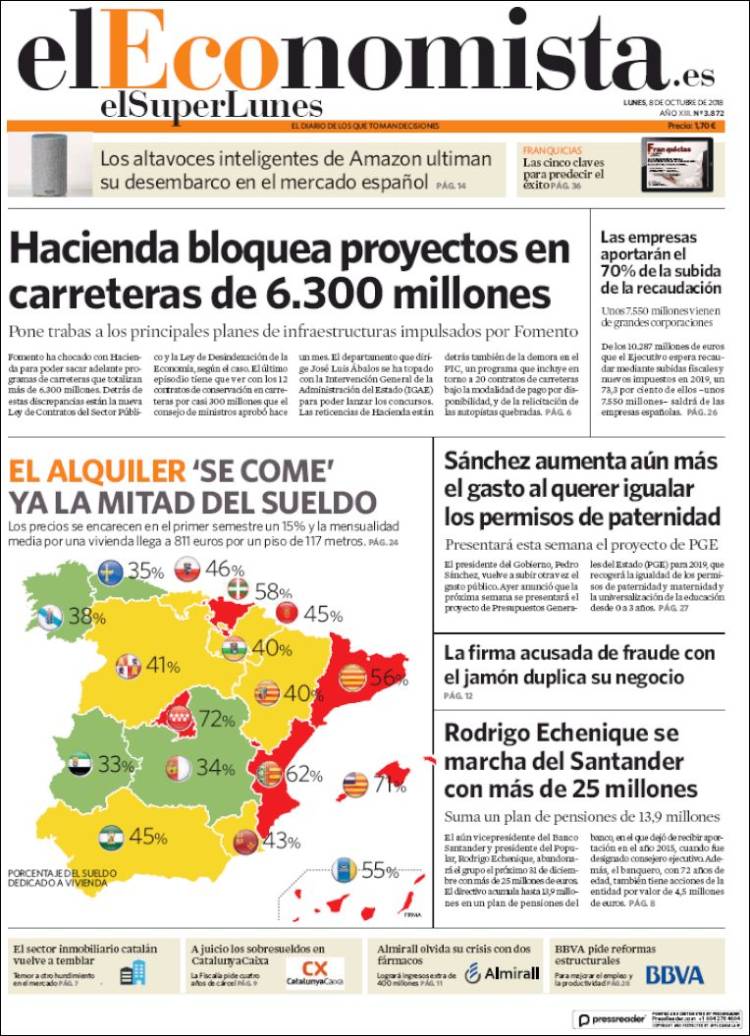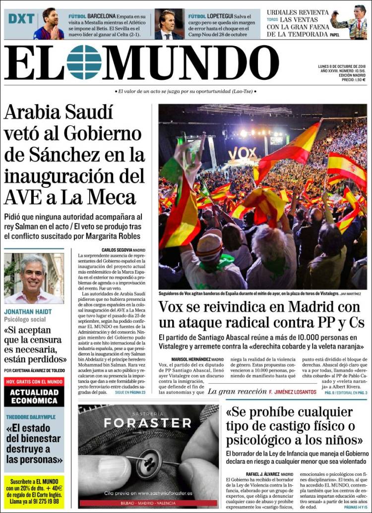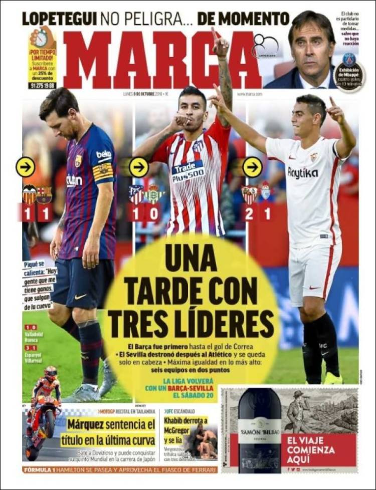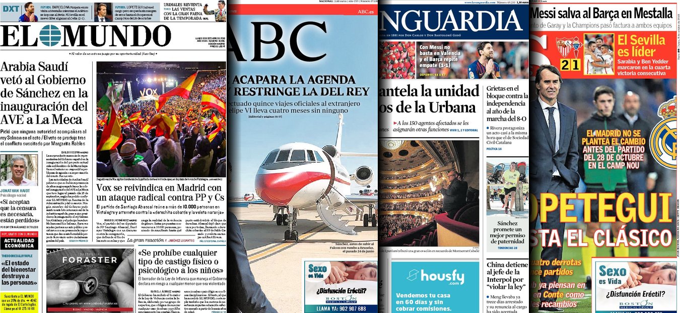 Portadas de los diarios El Mundo, El País, ABC, La Razón, La Vanguardia, El Periódico, Cinco Días, El Economista, Marca, As, Mundo Deportivo y Sport.