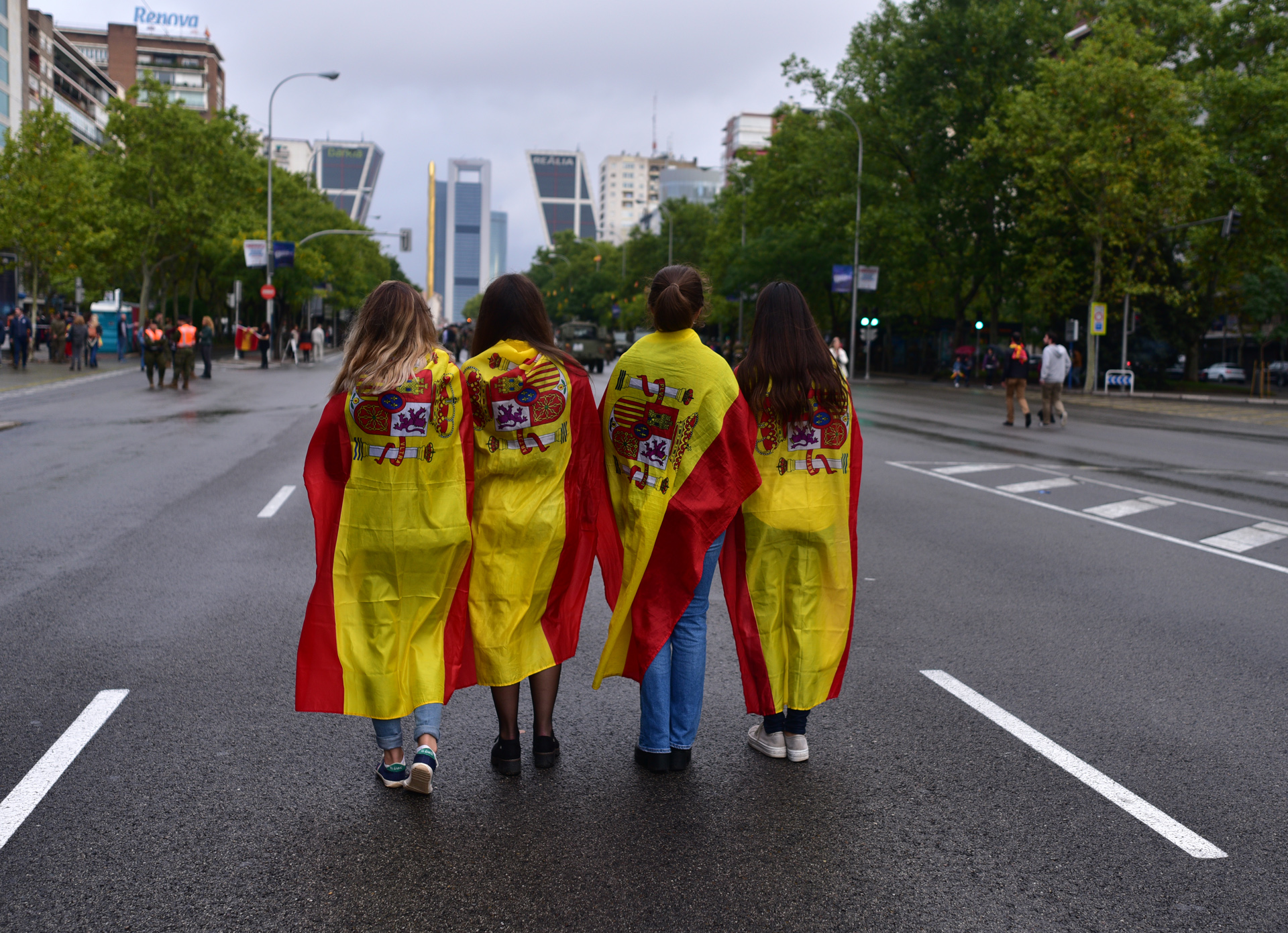 Cuatro jóvenes, portando la bandera de España a modo de capa, caminan en dirección a Plaza de Castilla, una hora antes del comienzo del desfile.