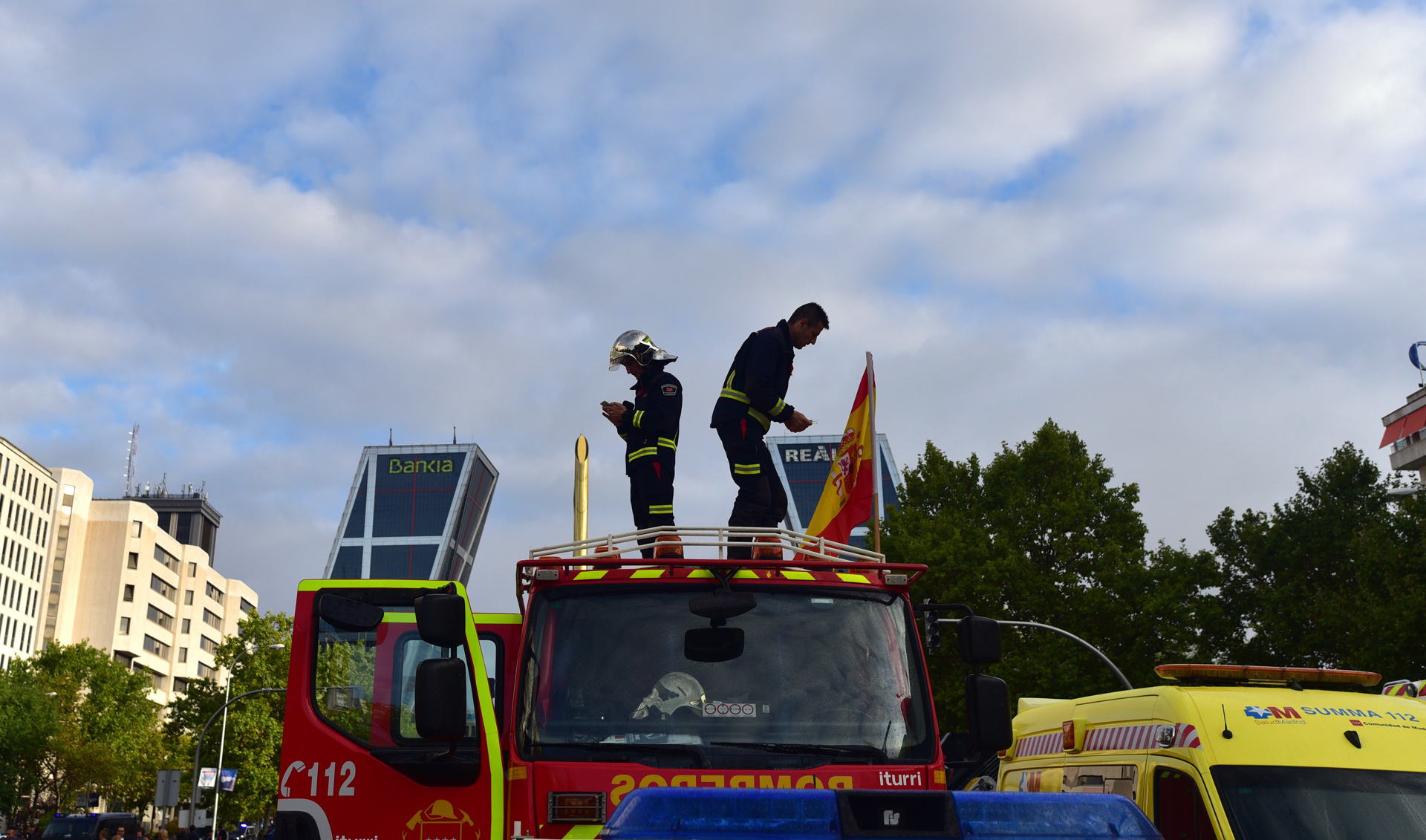 Dos bomberos subidos a su camión se preparan para el desfile del 12 de octubre.