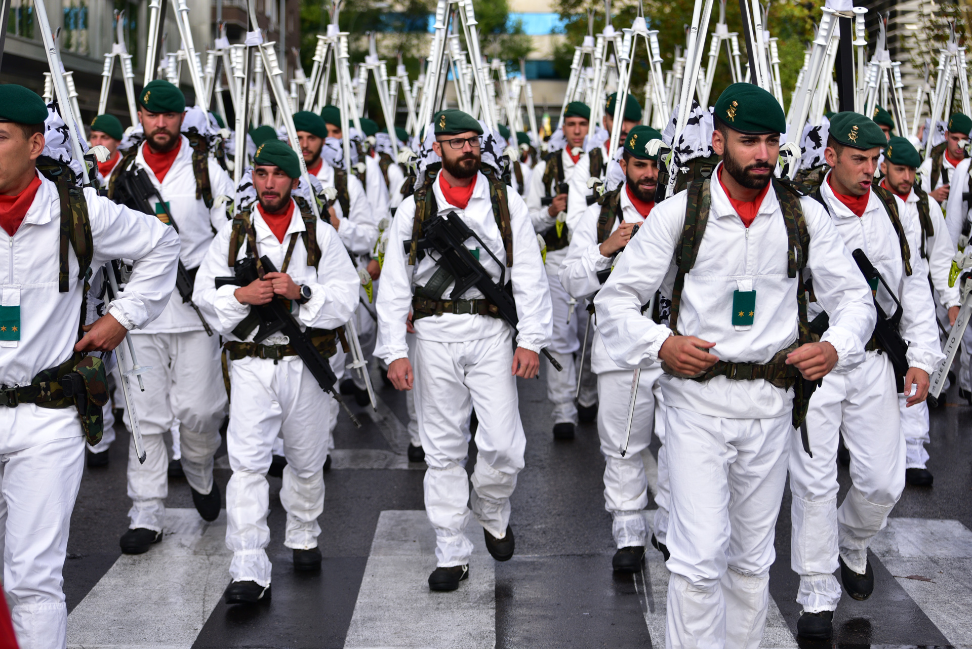 Los Cazadores de Montaña del Ejercito de Tierra portando su equipo al completo se dirigían horas antes a a su posición en el desfile.