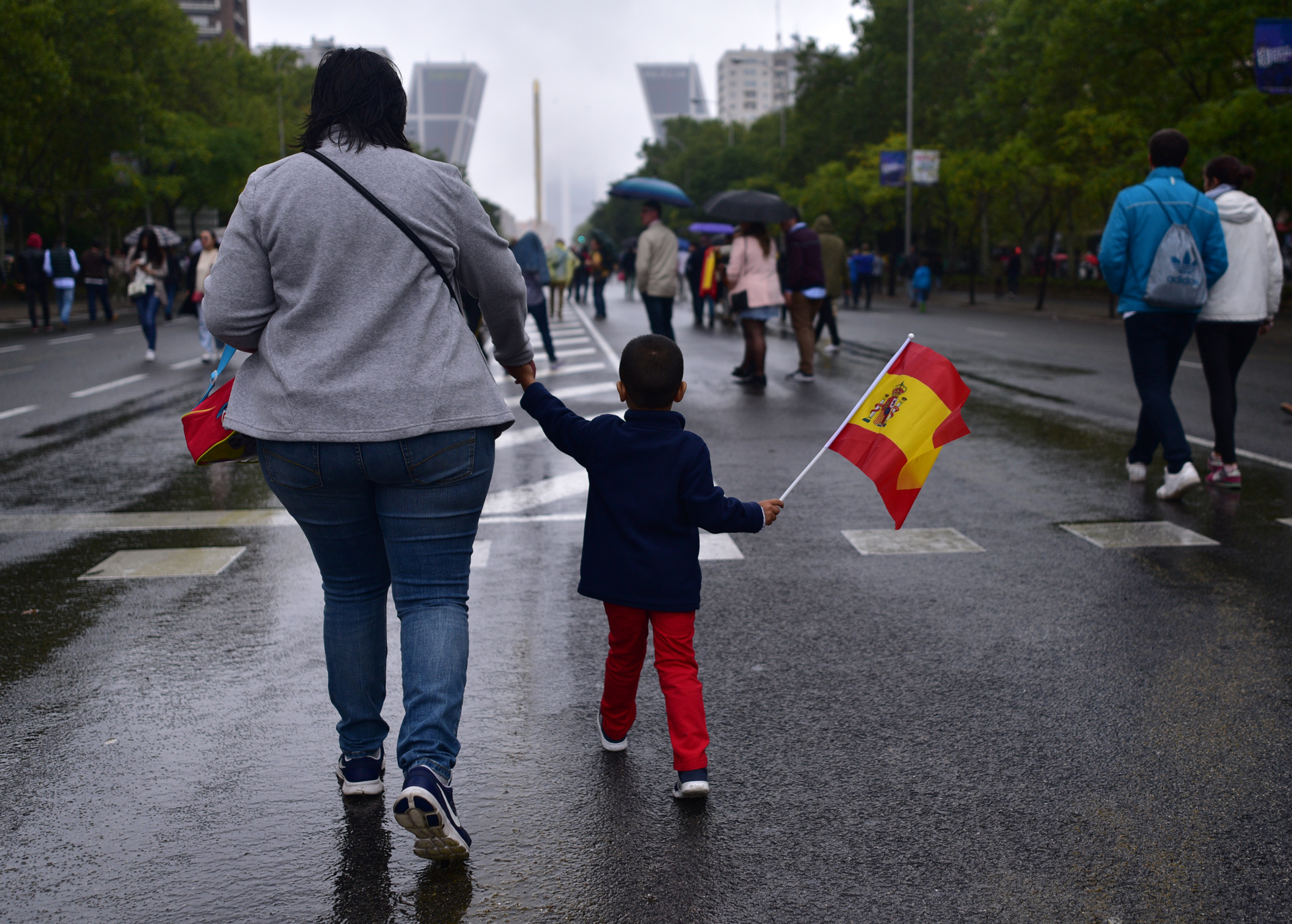 Al finalizar el desfile comenzó a llover. Una madre se dirige a Plaza de Castilla con su hijo de la mano.