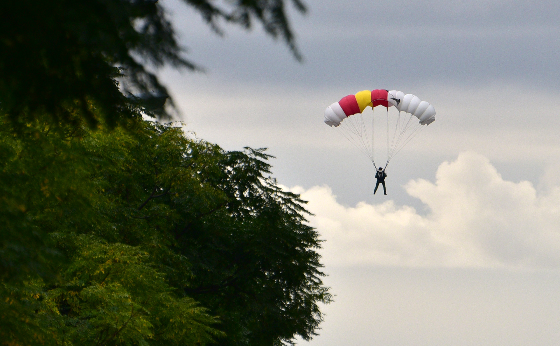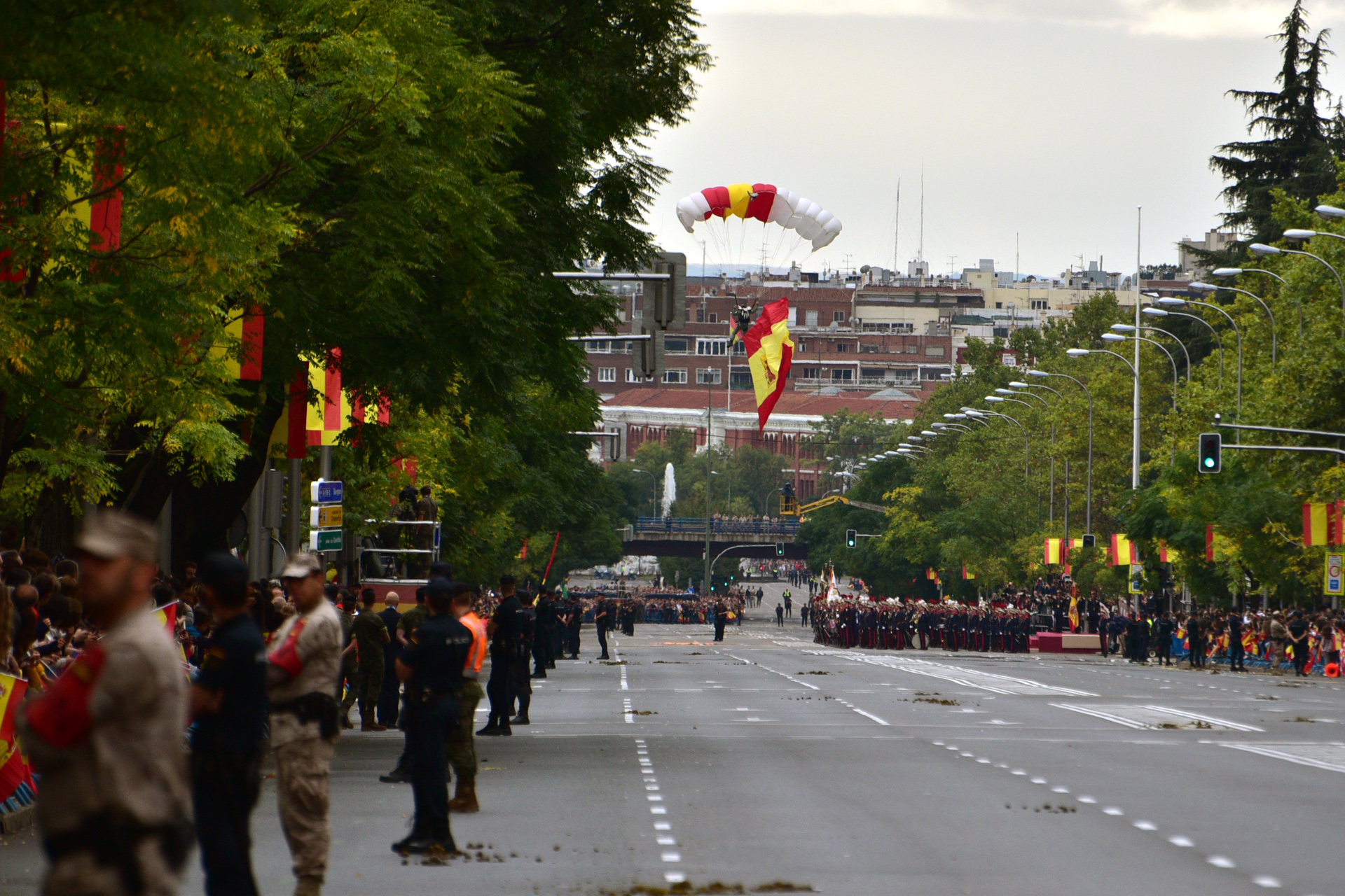 Paracaidista del Ejercito de Tierra sobre el Paseo de la Castellana, en Madrid.