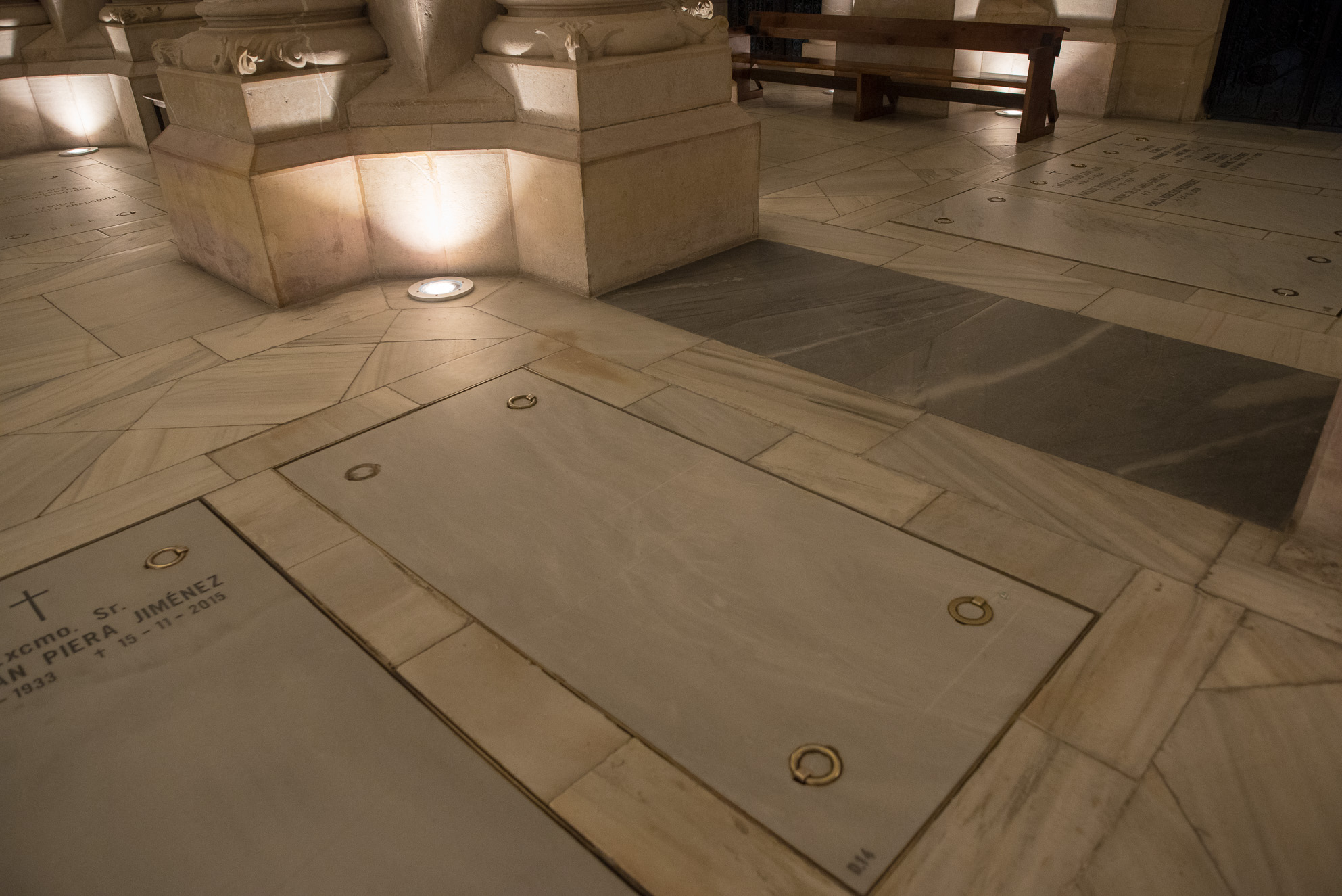 Una turista camina sobre una de las tumbas de la cripta de la catedral de La Almudena.