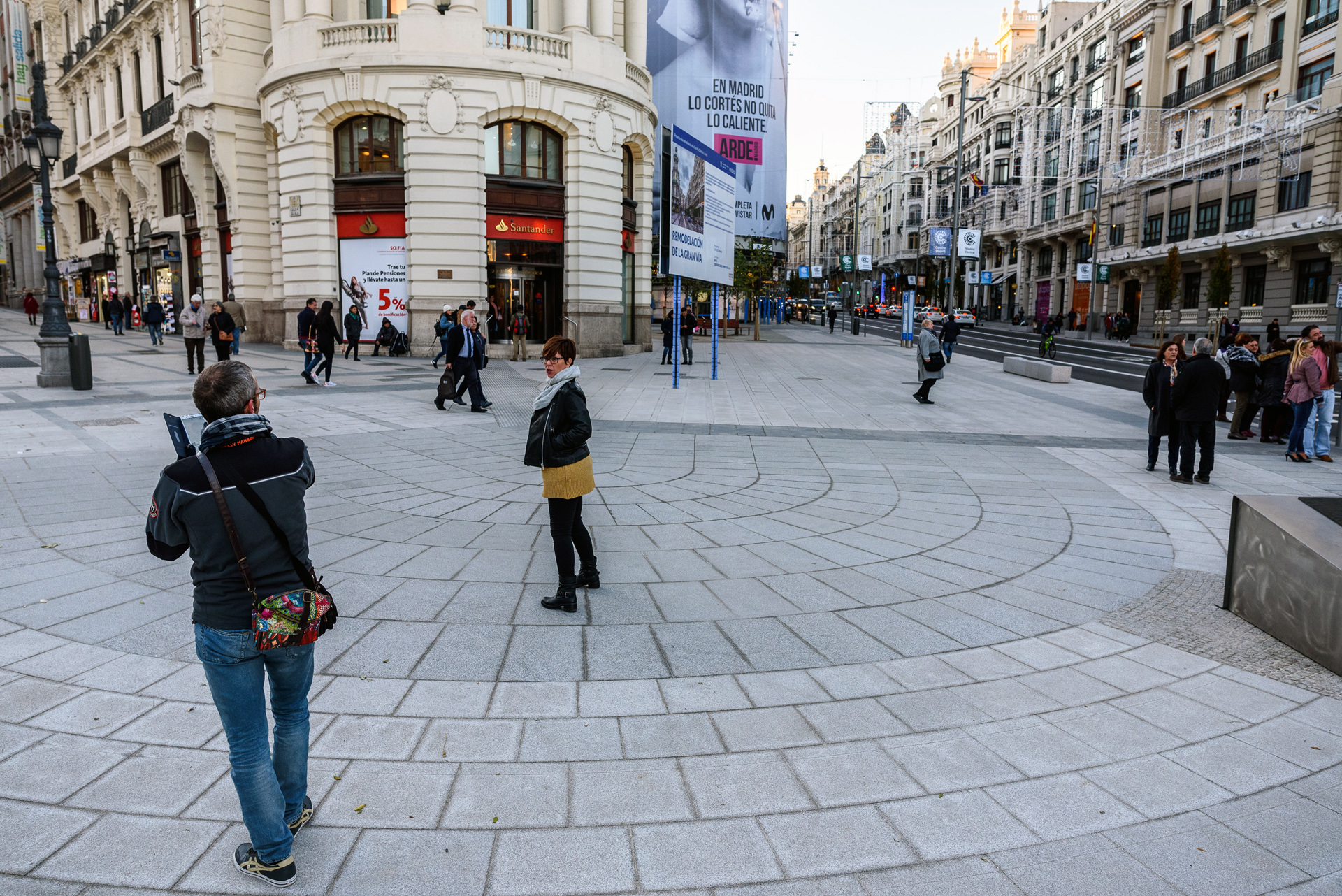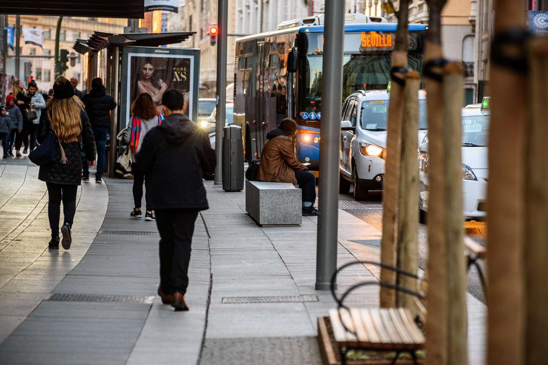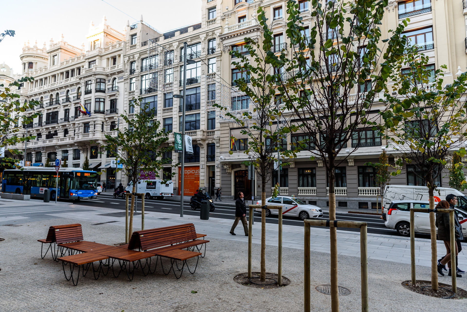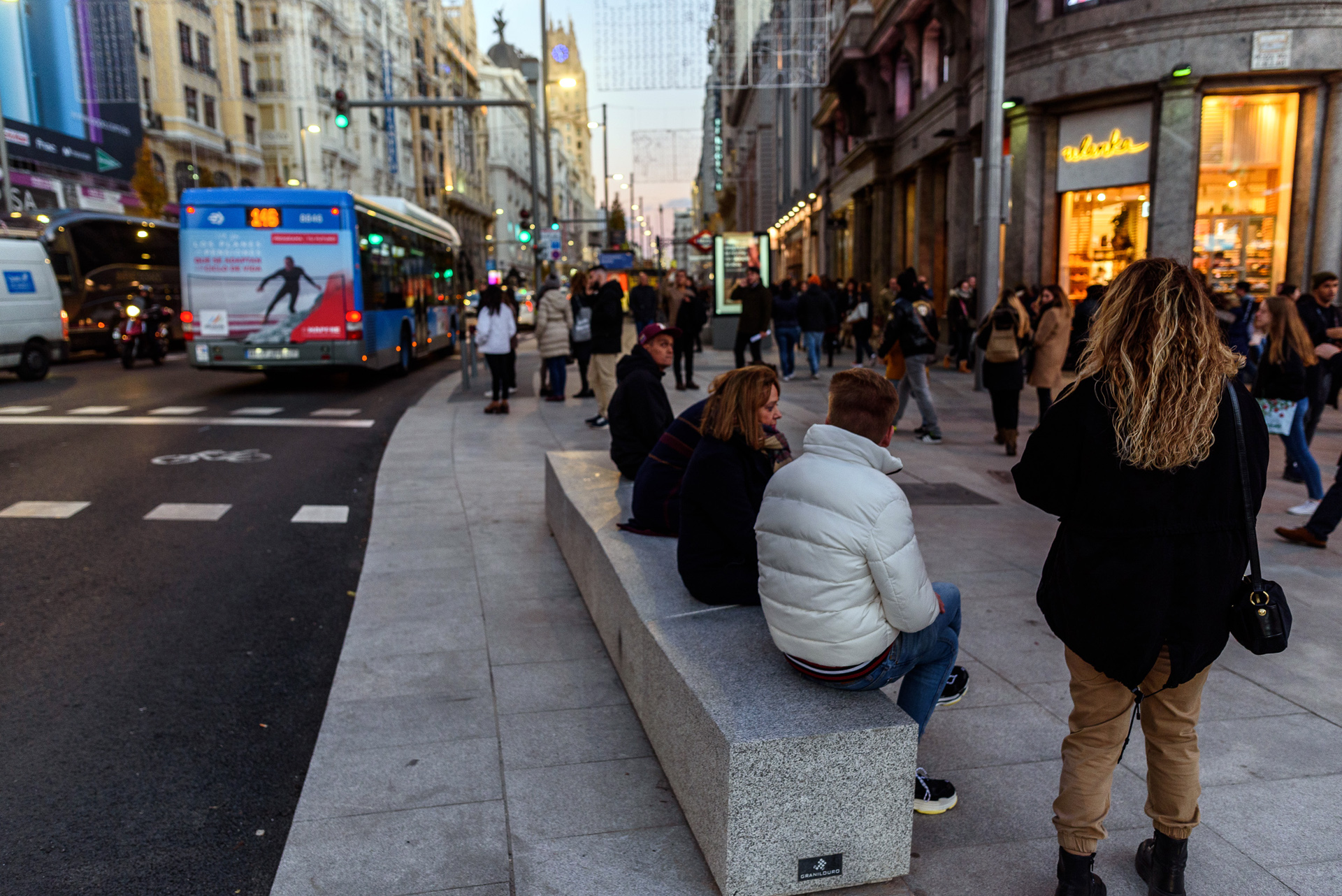 La emblemática Gran Vía madrileña ha sido renovada ampliando las aceras y añadiendo detalles del mobiliario urbano que no pasarán desapercibidos. Sus amplias y renovadas aceras pueden ser un lugar muy apetecible para manteros o mendigos.