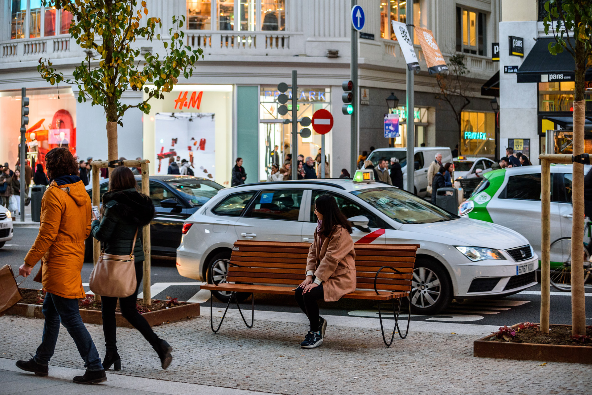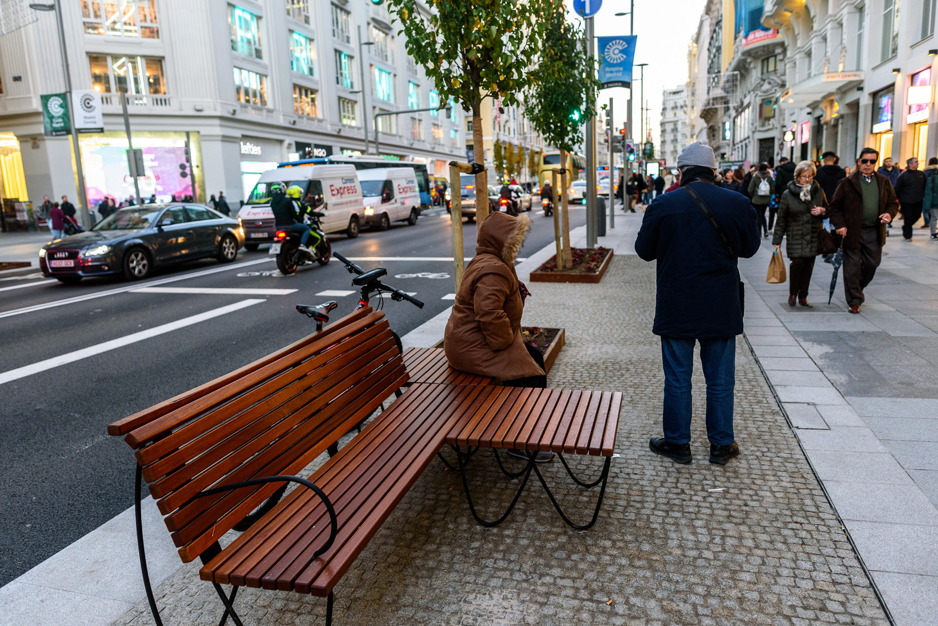Una mujer permanece sentada en uno de los bancos de madera instalados casi al borde de la acera en la Gran Vía.