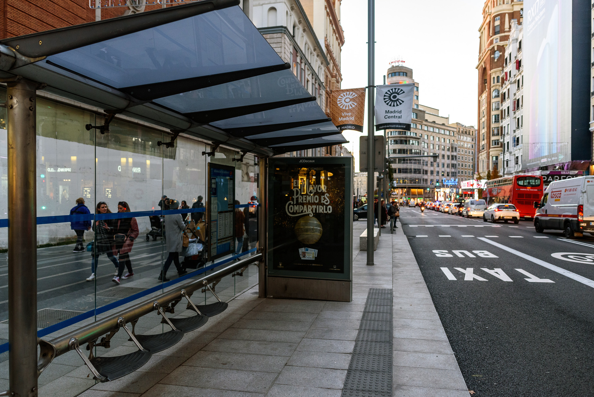 En todo el recorrido de la nueva Gran Vía se han reordenado las marquesinas de autobús "para optimizar el transporte público acercándolas a los pasos de peatones".