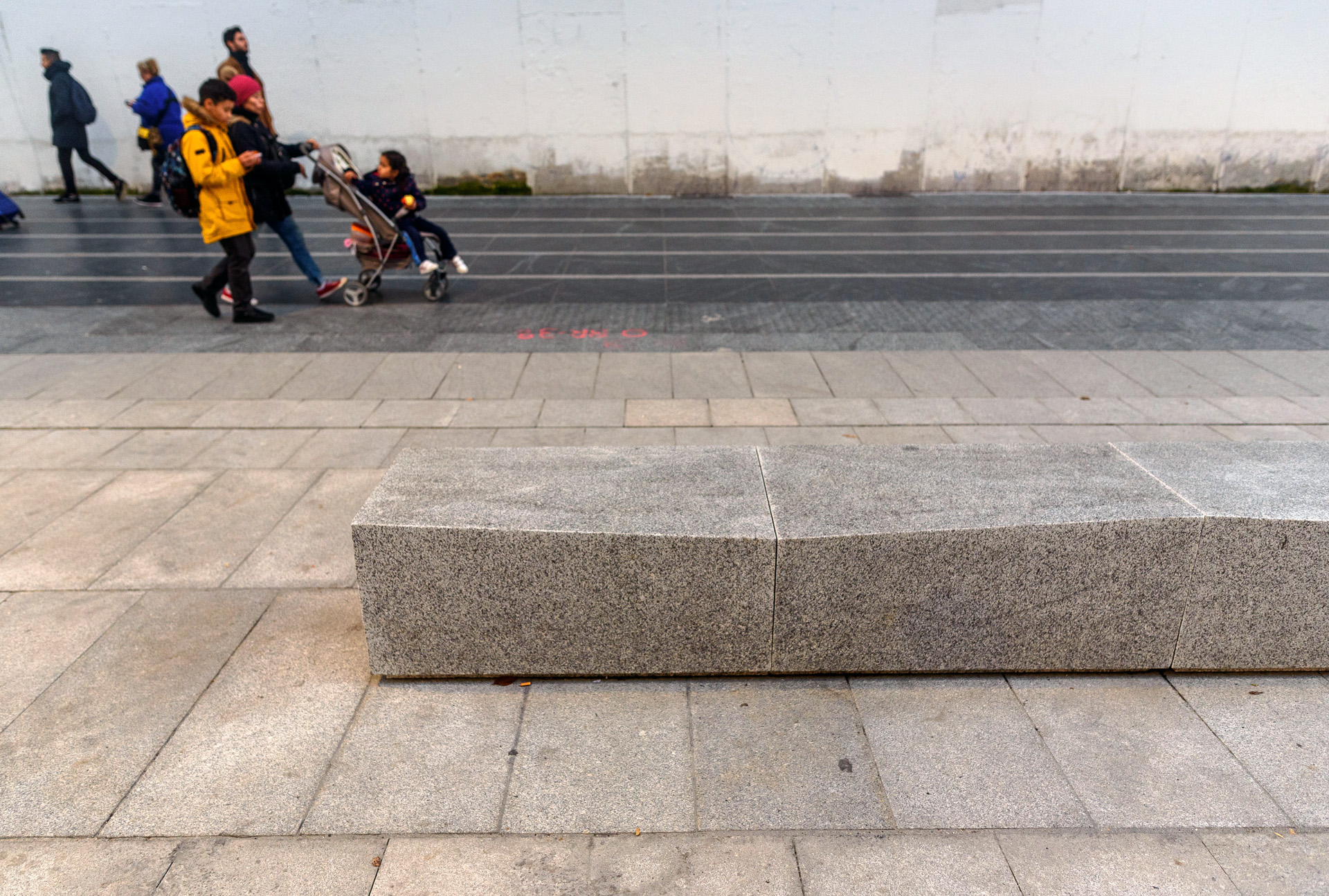 Varias personas permanecen sentadas mirando hacia la Plaza de Callao, sobre los nuevos bancos de piedra colocados por todo el recorrido de la nueva Gran Vía.