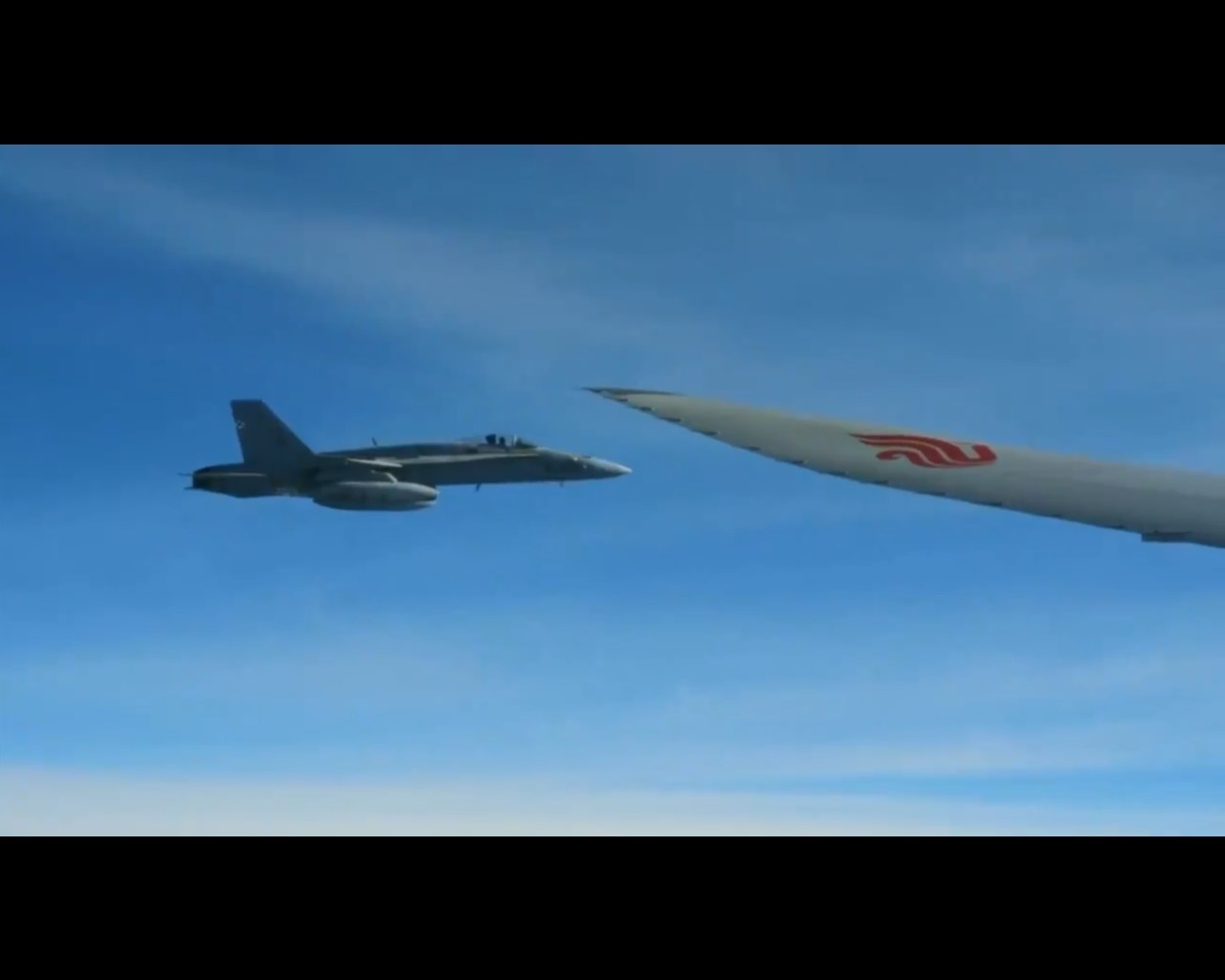 La agencia de noticias Xinhua News ha hecho públicas imágenes de cómo dos cazas F18 del Ejército del Aire español escoltaron al avión del presidente de China, Xi Jinping, a su llegada a España.