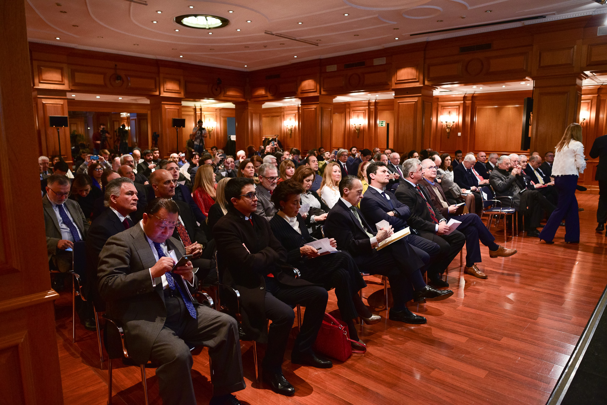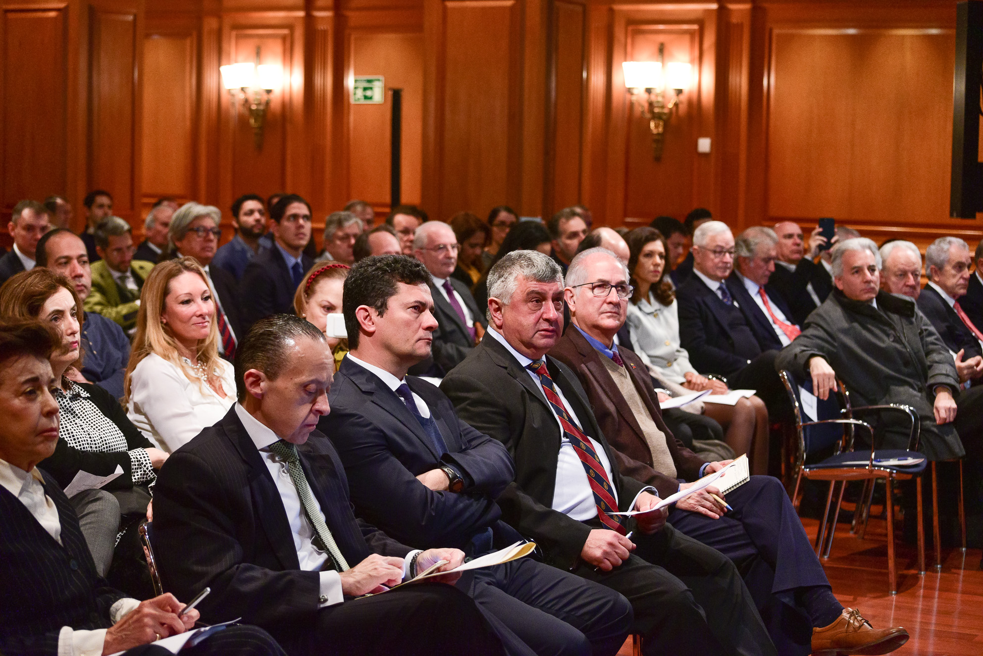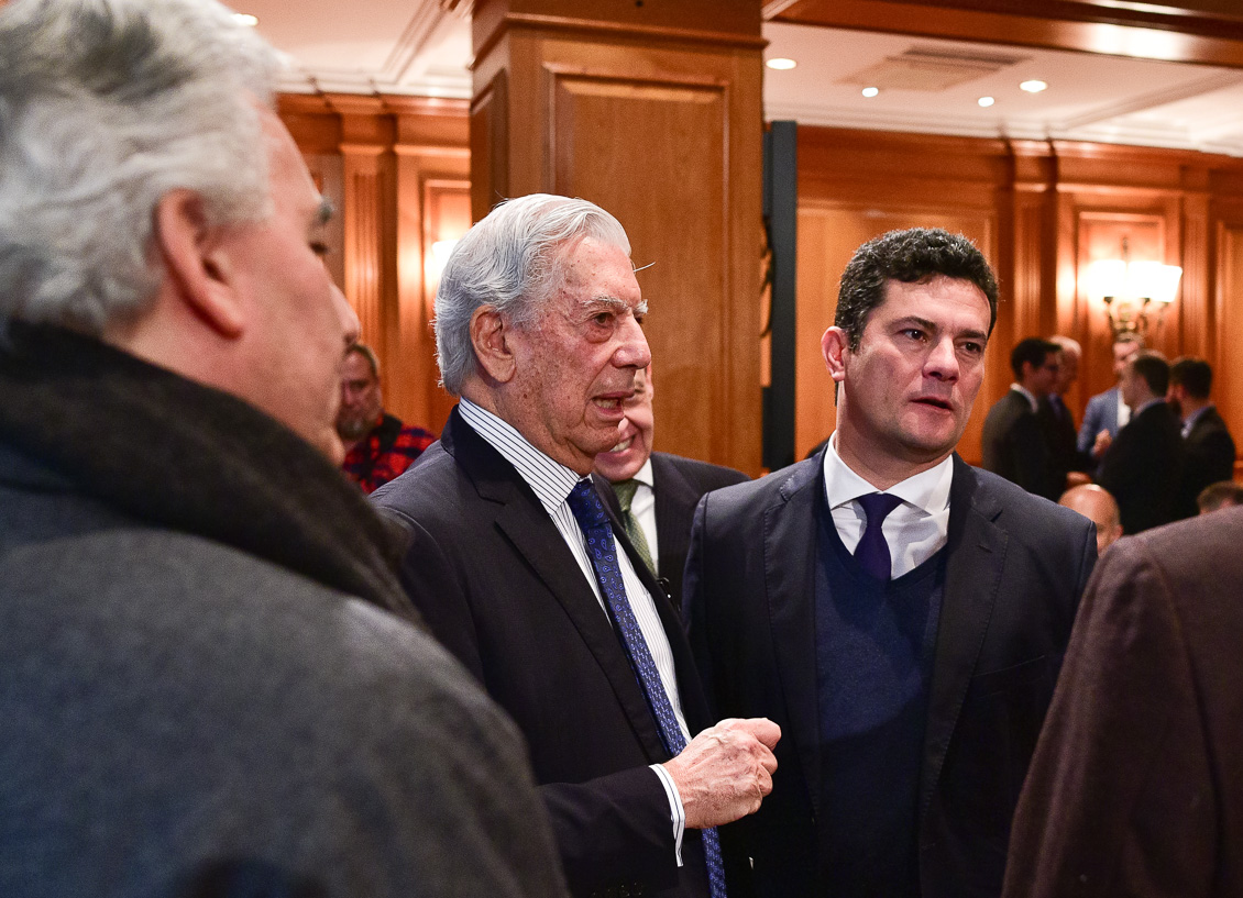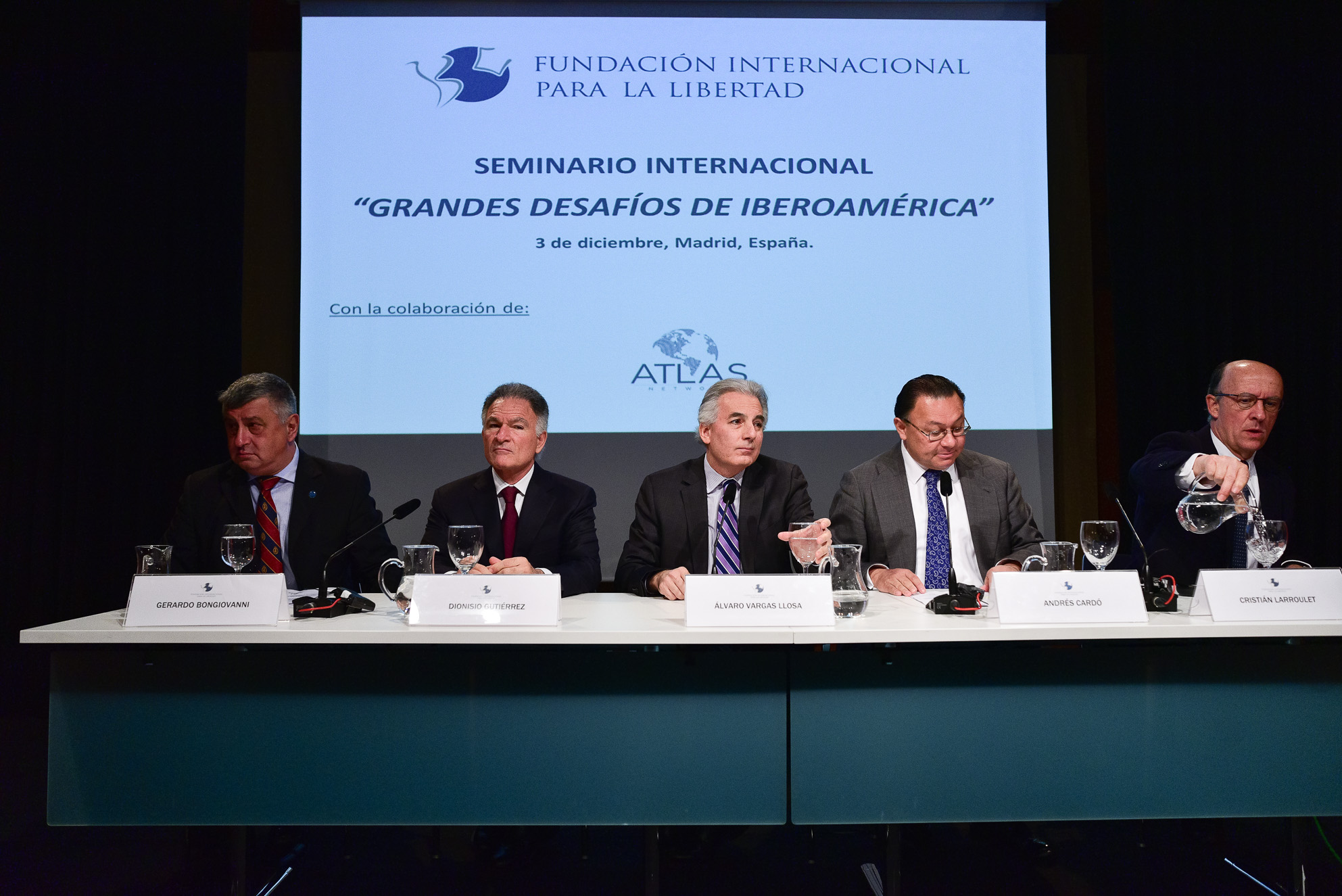 Mario Vargas Llosa, Marta Lucía Ramírez, Paulo Guedes, Sergio Moro, Manuel Valls, Dionisio Gutiérrez, Antonieta Mendoza de López, Álvaro Vargas Llosa, Antonio Ledezma, Cristián Larroulet, Lorent Saleh y Gerardo Bongiovanni, participan en el seminario internacional "Grandes desafíos de Iberoamérica", celebrado en el Instituto Cervantes de Madrid.