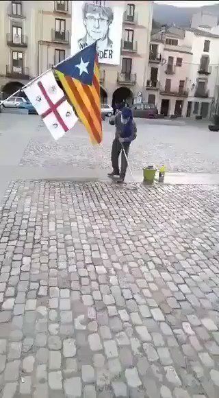 Un grupo de vecinos de Amer, localidad natal del prófugo Puigdemont, barre la plaza al grito de "¡desinfectemos!", después de la visita de Inés Arrimadas.
