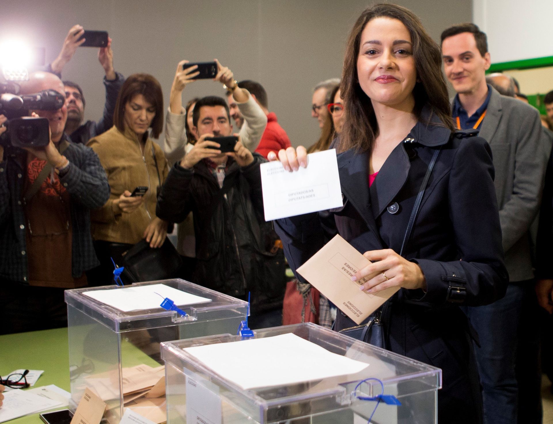 Arrimadas votaba en un colegio del barrio de las Corts, en Barcelona. "Una demócrata frente a una sectaria separatista", ha denunciado Rivera en Twitter.