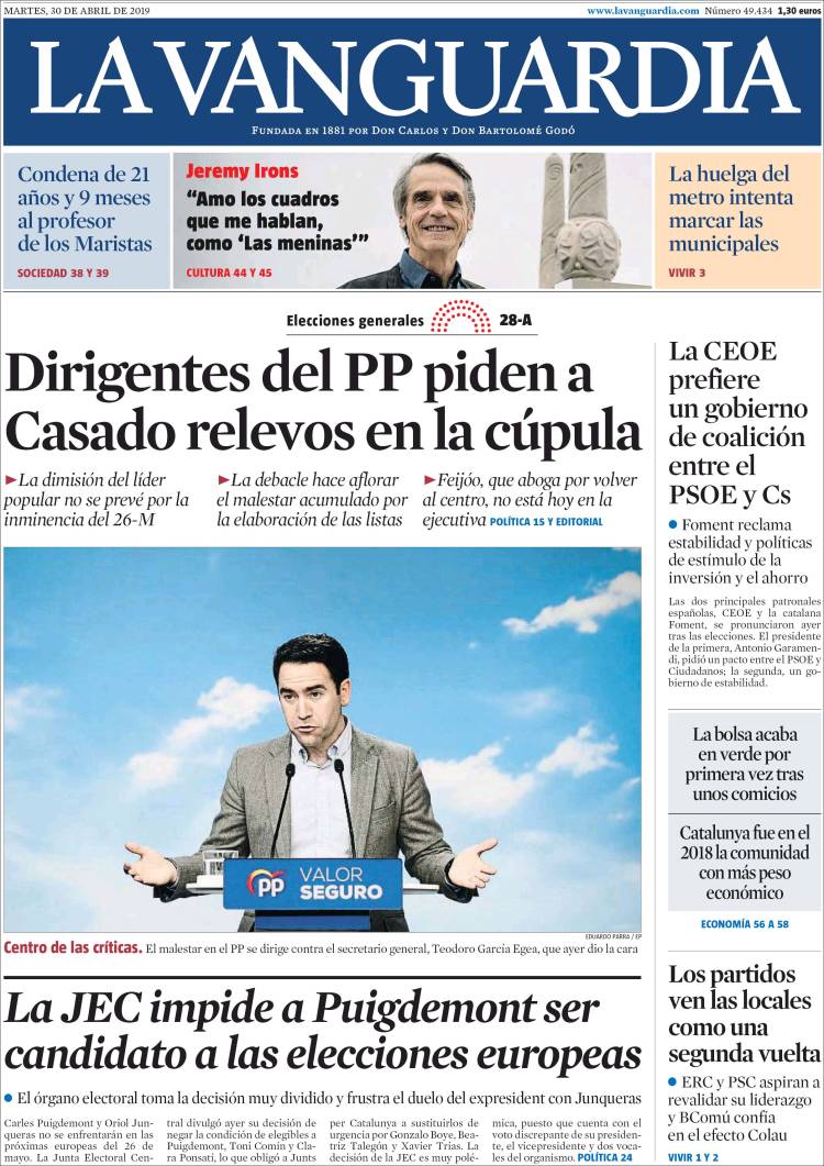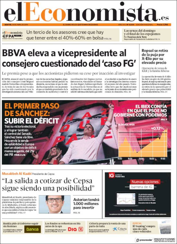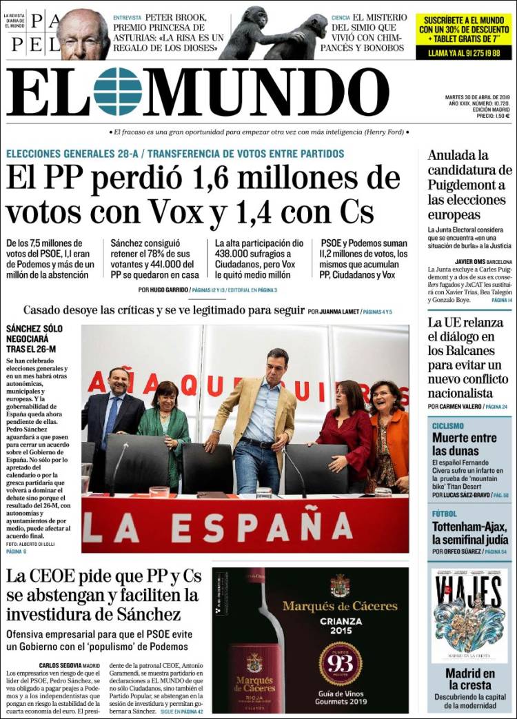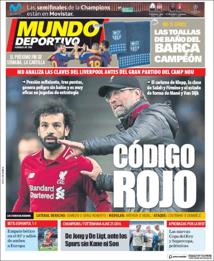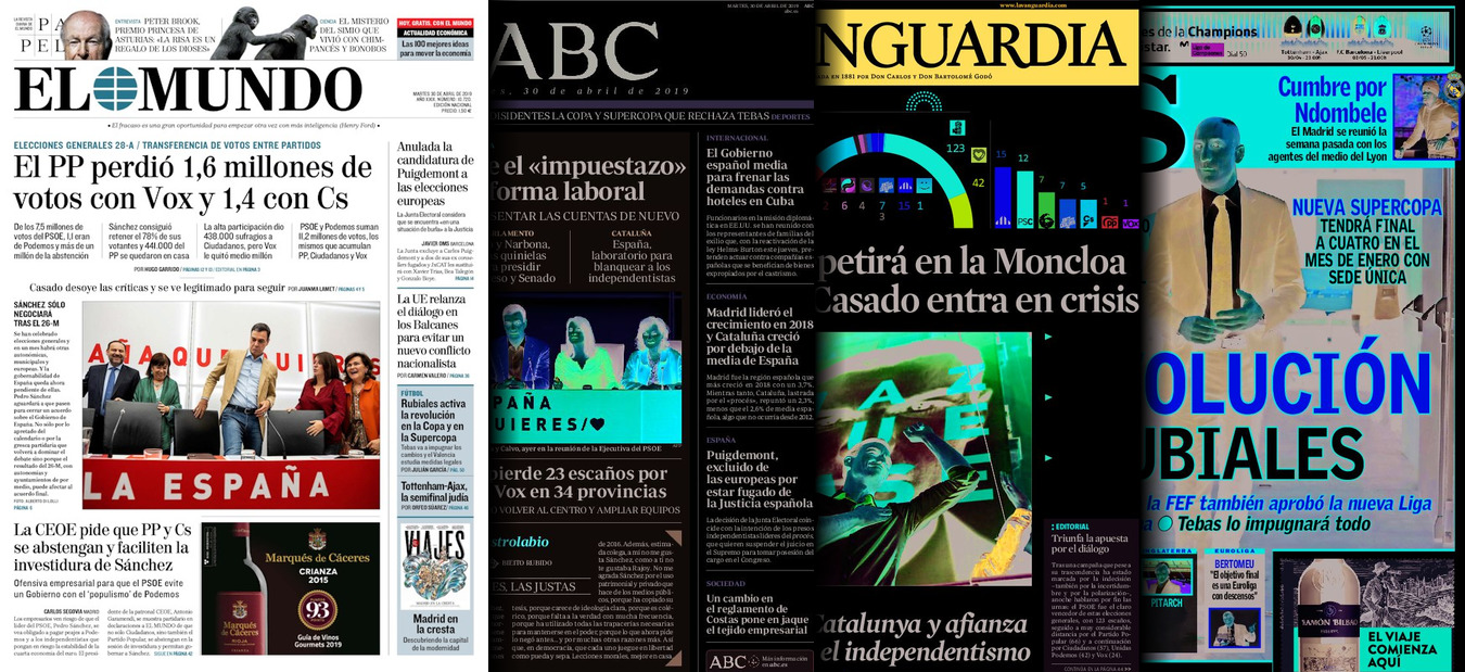Portadas de los diarios El Mundo, El País, ABC, La Razón, La Vanguardia, El Periódico, El Economista, Marca, As y Mundo Deportivo.