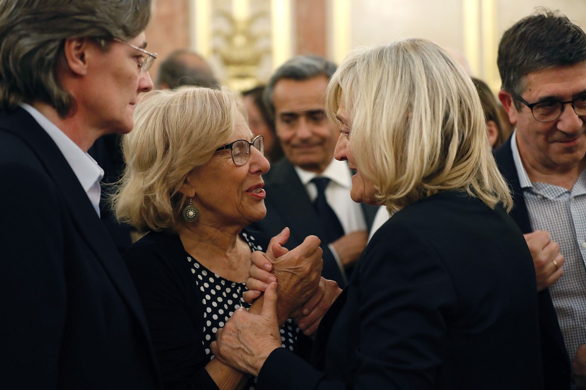 La alcaldesa de Madrid también se ha querido acercar a la capilla ardiente para acompañar a la viuda de Rubalcaba.