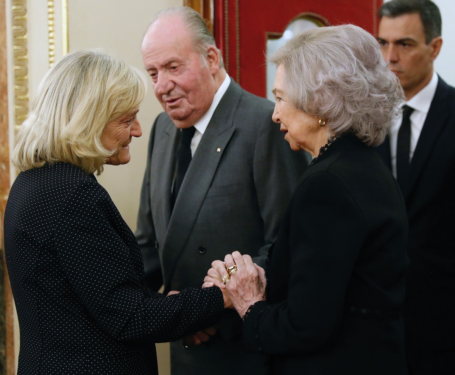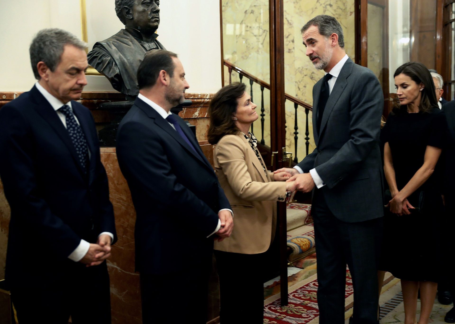 Los reyes eméritos Juan Carlos y Sofía dan el pésame a la viuda del exvicepresidente del Gobierno Alfredo Pérez Rubalcaba, Pilar Goya (i), en la capilla ardiente instalada en el Congreso de los Diputados.