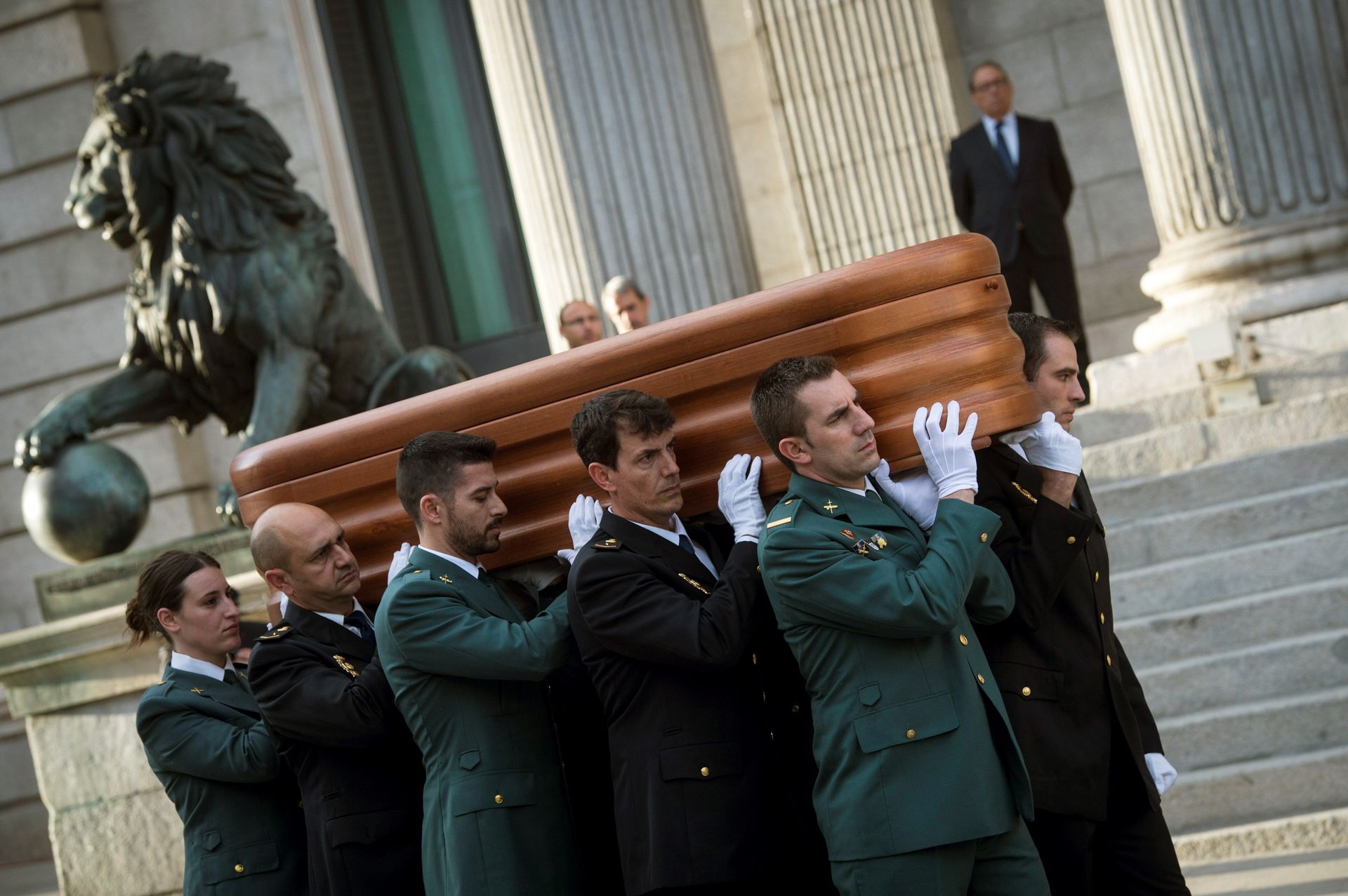 Una bandera de España y otra del PSOE cubrían el féretro de Alfredo Pérez Rubalcaba.