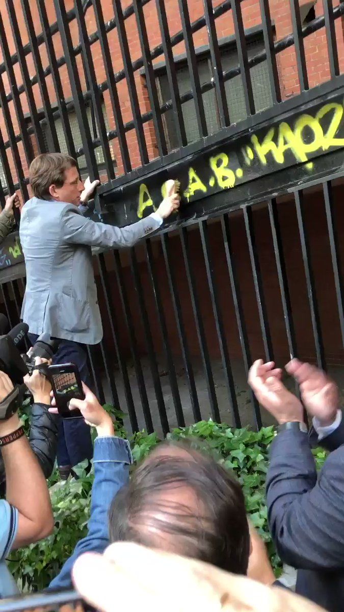 José Luis Martínez-Almeida, cepillo en mano, limió la pintada hecha en el centro cultural El Madroño, en Vicálvaro, tras un mitin. "Es un acrónimo que dice que todos los policías son unos bastardos, el mismo acrónimo que utilizó Íñigo Errejón", ha dicho Almeida recordando que Sánchez Mato es el concejal de distrito.