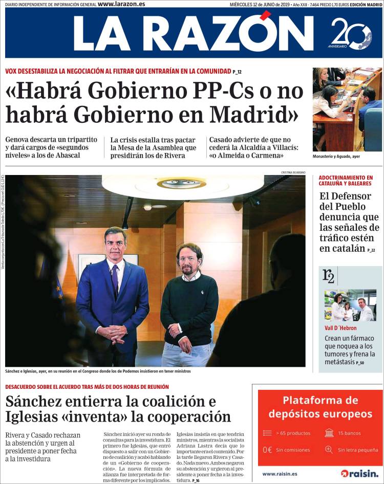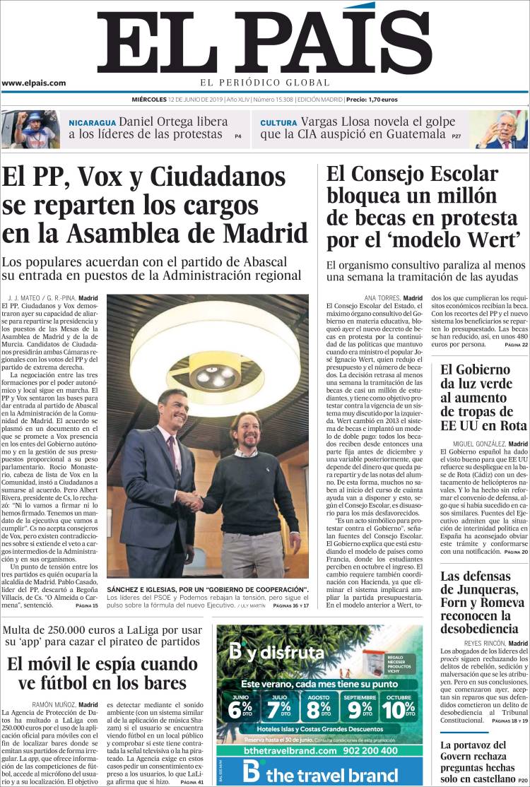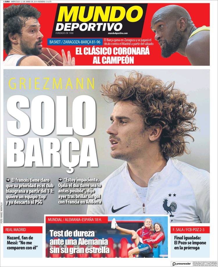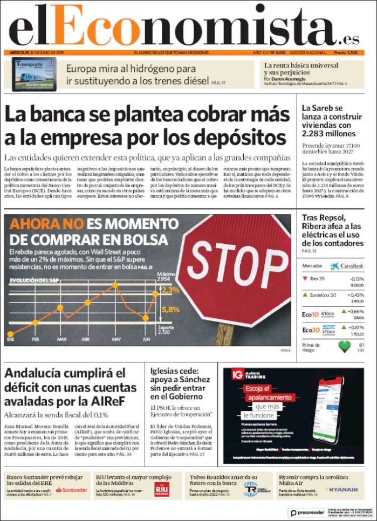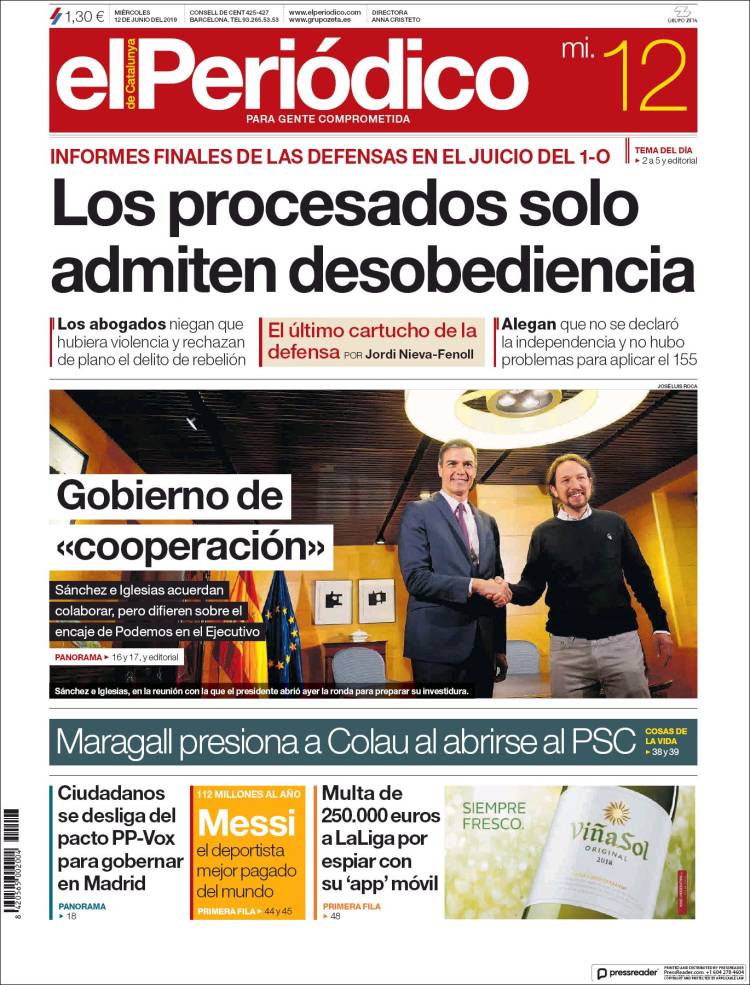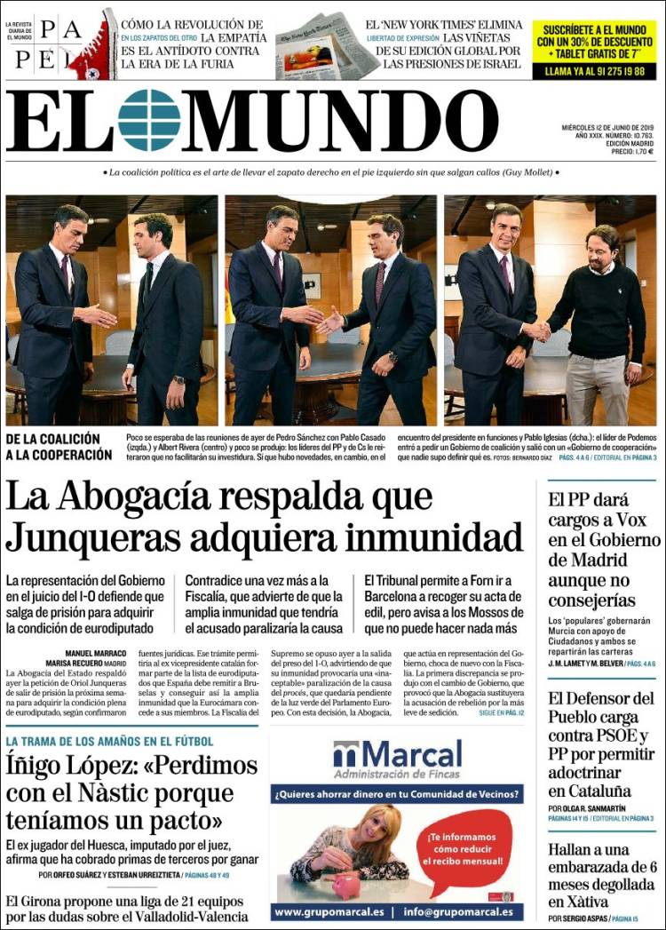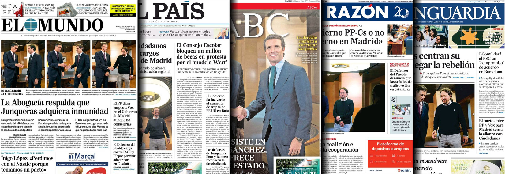 Portadas de los diarios El Mundo, El País, ABC, La Razón, La Vanguardia, El Periódico, El Economista, Marca, AS, Mundo Deportivo y Sport.
