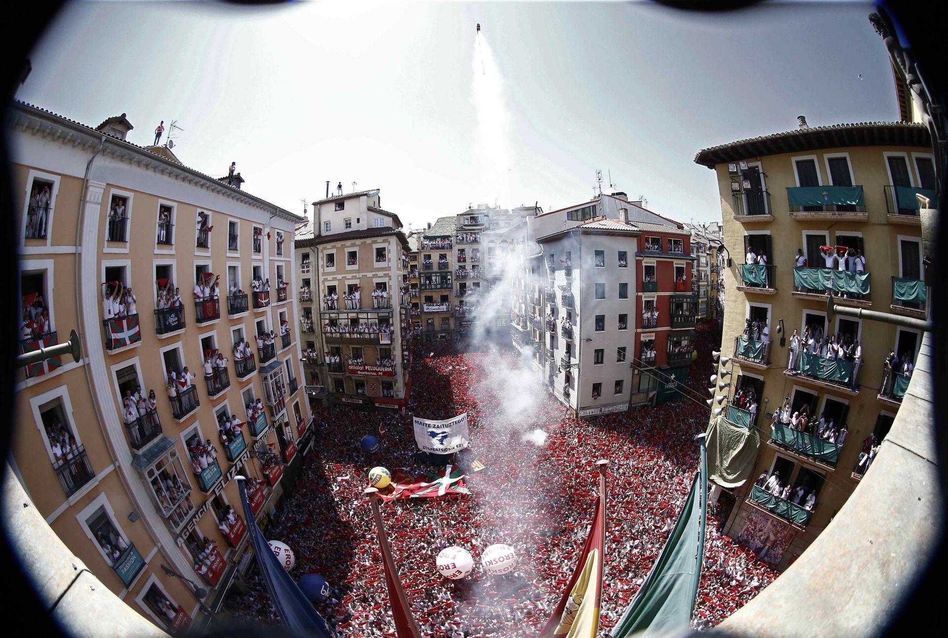 El subdirector de la banda La Pamplonesa, Jesús Garísoain, acompañado del alcalde Enrique Maya, ha sido el encargado este año de prender la mecha del chupinazo.