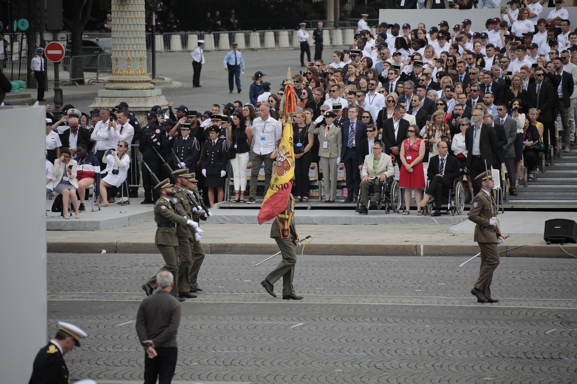 La bandera de España desfiló en los Campos Elíseos de París durante la celebración de la Fiesta Nacional francesa.