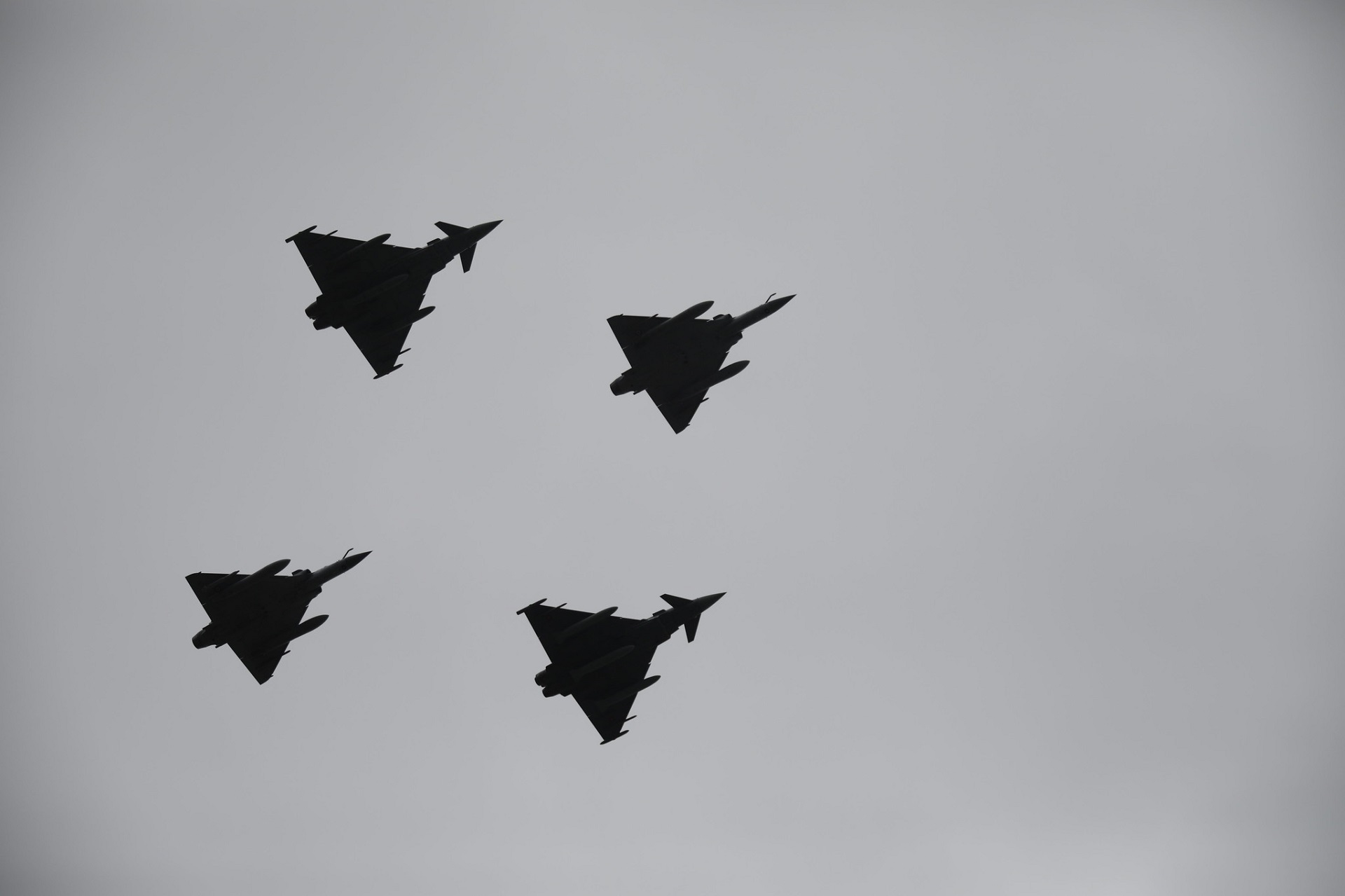 Cazas de combate Eurofighter del Ejército del Aire español sobrevuelan las calles del centro de París acompañados por dos cazas Rafale franceses en el acto central del 14 de Julio.
